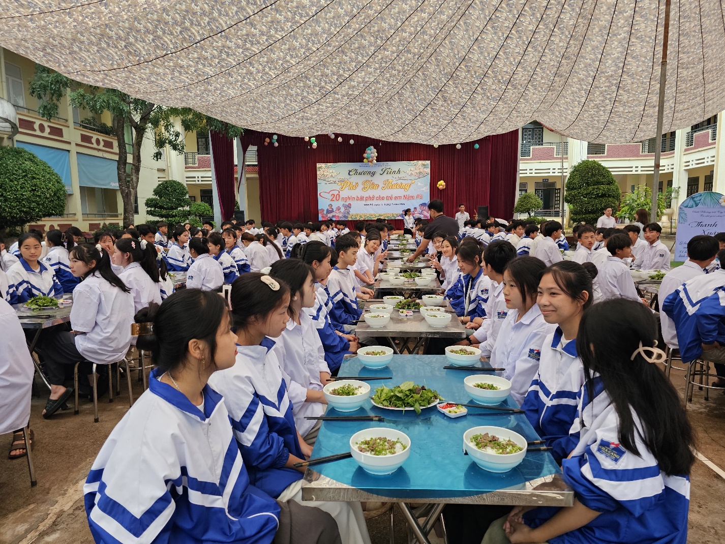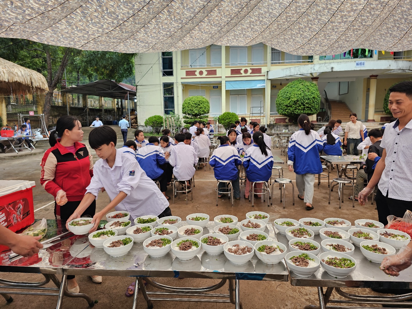 Không khí sân trường trở nên rộn ràng hơn bao giờ hết. Những dãy bàn ghế được kê ngay ngắn, nồi nước dùng nghi ngút khói, từng bát phở được múc ra nóng hổi, thơm lừng. Các em học sinh phần lớn là con em dân tộc thiểu số, đa số các em thuộc gia đình khó khăn không giấu nổi niềm vui. Nhiều em đến sớm để cùng thầy cô chuẩn bị, chia bát, kê bàn, mời bạn. Với các em, đây không chỉ là một bữa ăn ngon, mà là một món quà tinh thần bất ngờ và ấm áp, là cảm giác được quan tâm, được yêu thương giữa mái trường thân thuộc.