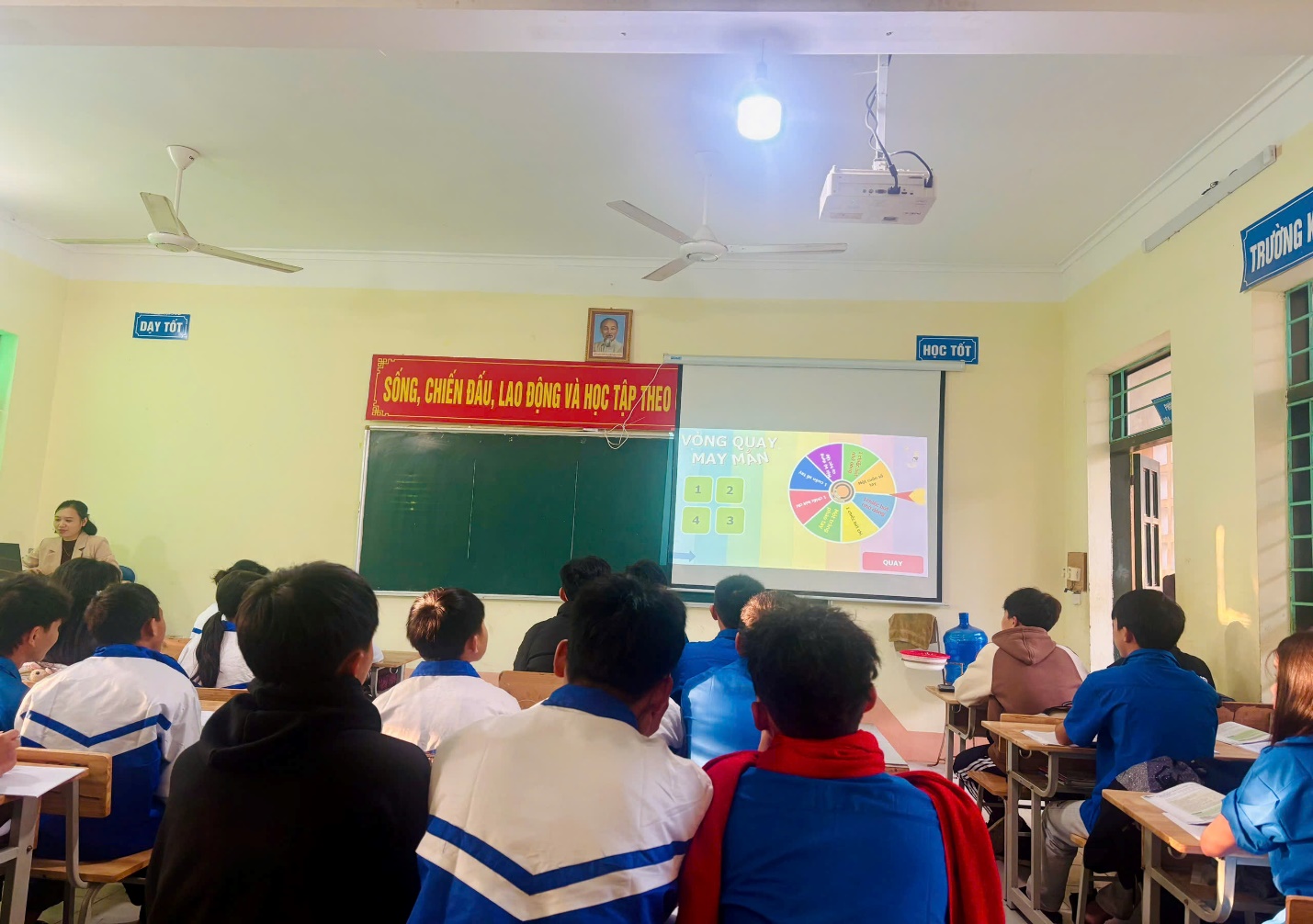 Học sinh hào hứng tham gia trò chơi “vòng quay may mắn” trong tiết dạy môn Vật lý “ Chuyển động ném” của cô giáo Mai Thị Trang.