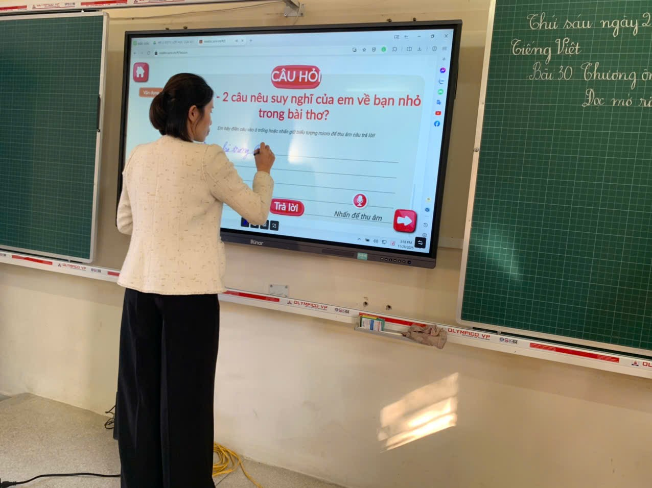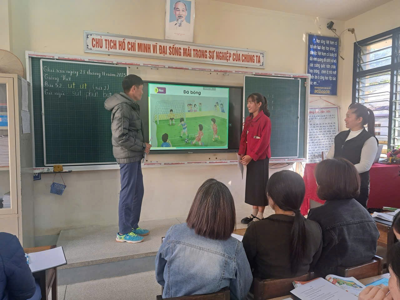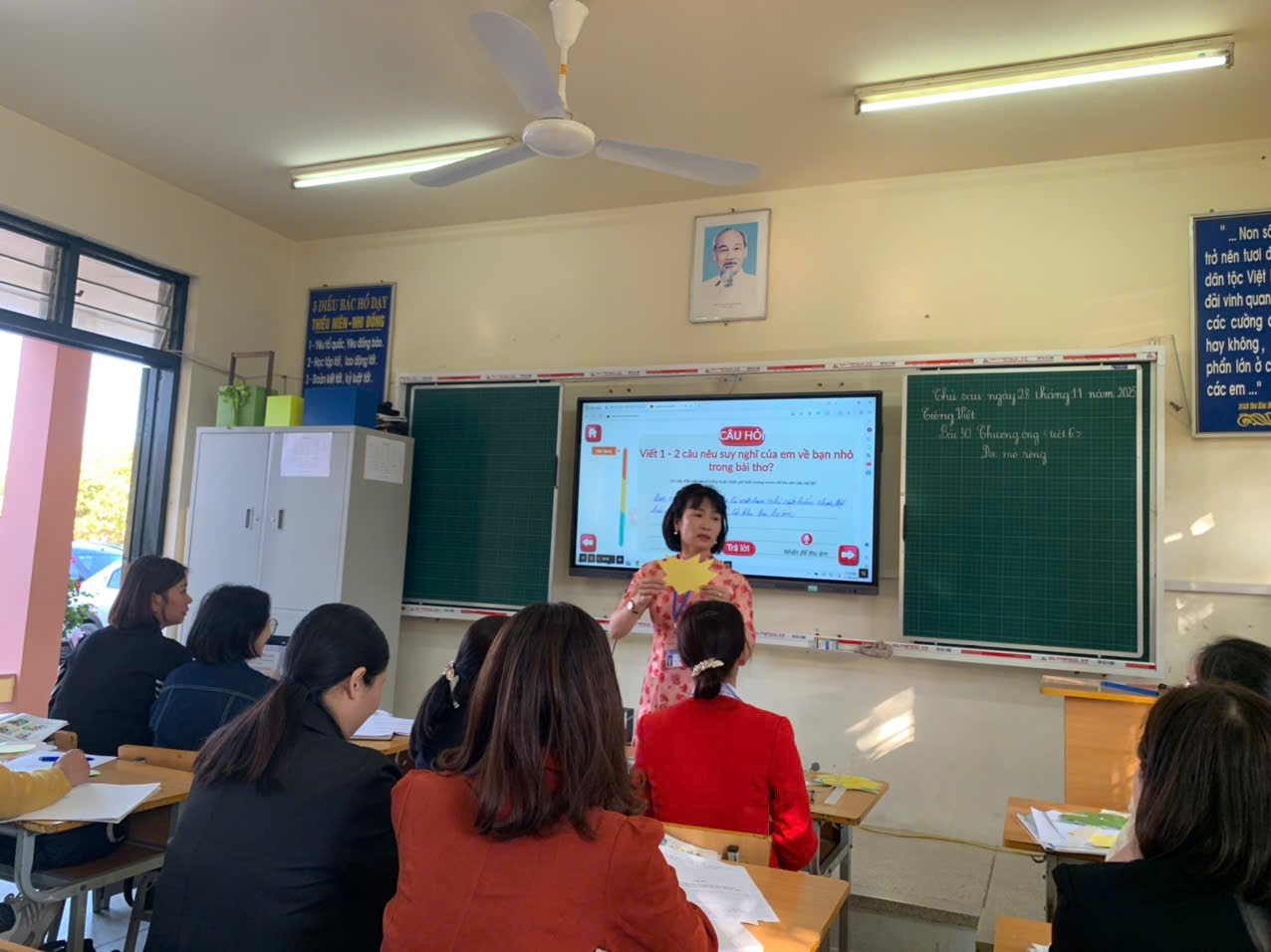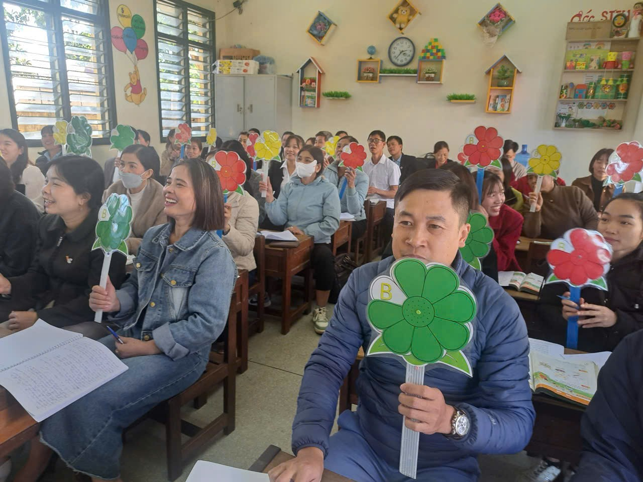 Giáo viên đóng vai là học sinh tại tiết học thực hành sinh hoạt chuyên môn cụm