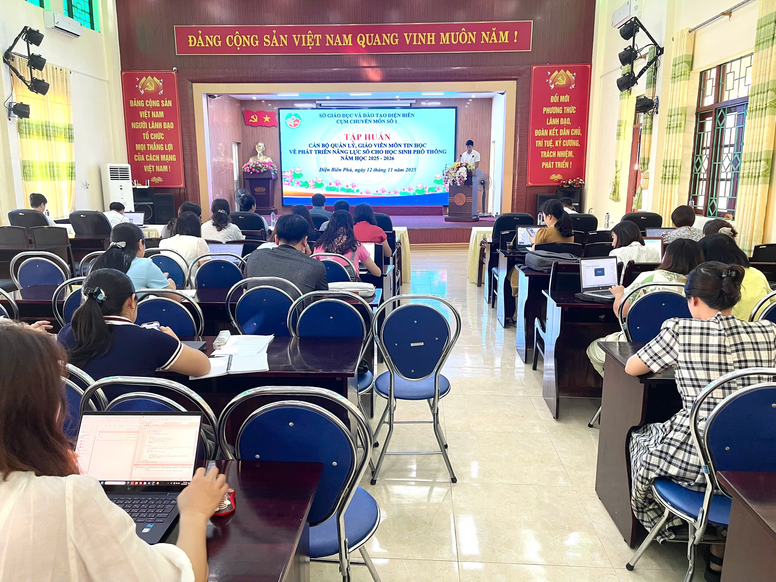 Thực hiện các văn bản chỉ đạo của Sở Giáo dục và Đào tạo về việc bồi dưỡng đội ngũ cán bộ quản lý, giáo viên cốt cán trong lĩnh vực phát triển năng lực số, chiều ngày 12/11/2025, Cụm hoạt động chuyên môn số 1 đã tổ chức tập huấn chuyên đề “Phát triển năng lực số trong giáo dục” cho cán bộ quản lý và giáo viên môn Tin học tại Trung tâm GDNN-GDTX số 1.