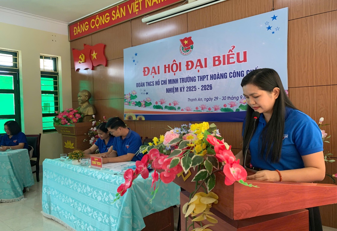 Thay mặt Đoàn Chủ tịch, đồng chí Nguyễn Thị Lan Anh, Bí thư Đoàn trường đã trình bày Báo cáo tổng kết công tác Đoàn và phong trào Thanh niên của Đoàn TNCS Hồ Chí Minh Trường THPT Hoàng Công Chất nhiệm kỳ 2024-2025 và phương hướng nhiệm vụ công tác nhiệm kỳ 2025-2026.