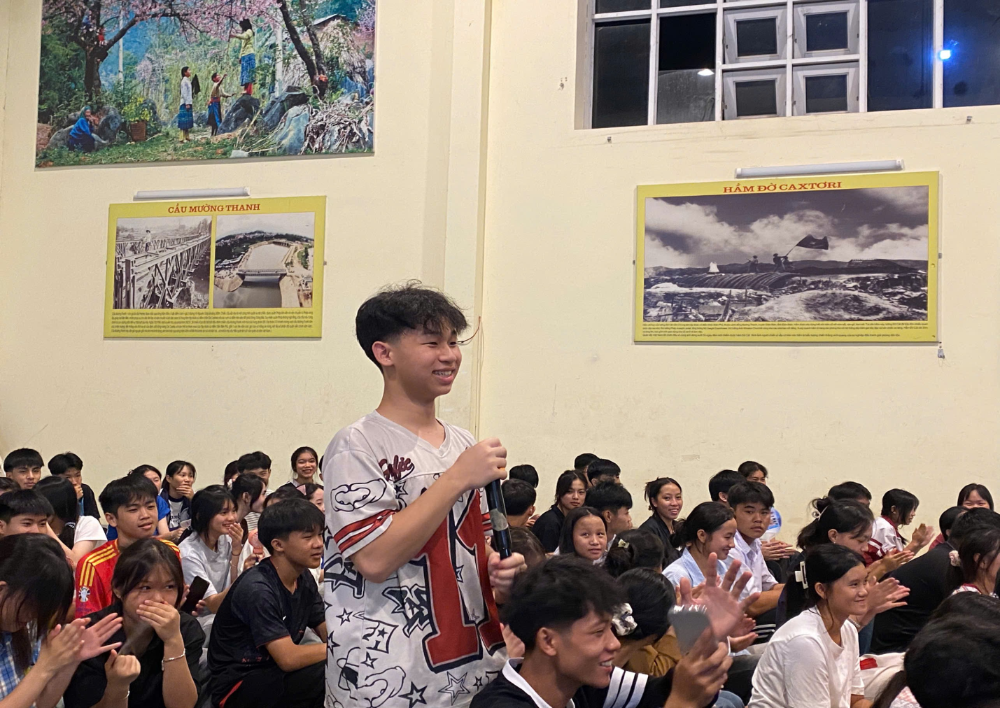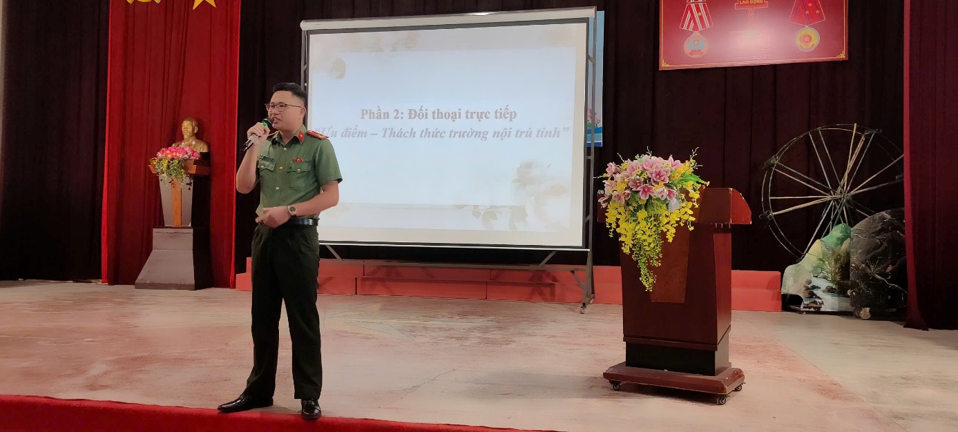 Thượng úy Chớ A Sàng – Phó ban Thanh niên Công an tỉnh Điện Biên - Cựu học sinh nhà trường giao lưu, chia sẻ với các tân học sinh lớp 10 về cách vượt qua những khó khăn, thách thức trong môi trường sống, học tập mới khi mới nhập trường