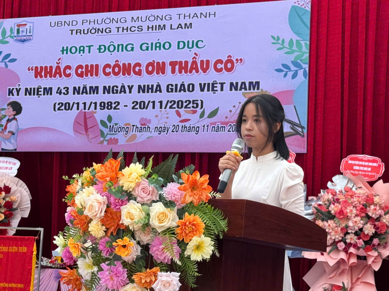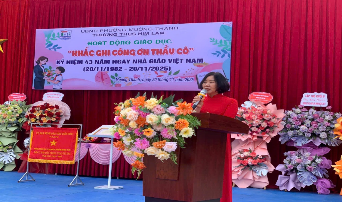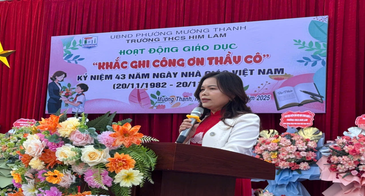 Tiếp nối chương trình, Nhà giáo ưu tú Cao Thị Đại - Hiệu trưởng nhà trường phát biểu chúc mừng Ngày Nhà giáo Việt Nam 20/11 và khẳng định niềm tự hào về truyền thống dạy tốt – học tốt của trường THCS Him Lam. Cô ghi nhận sự nỗ lực của đội ngũ thầy cô trong hành trình đổi mới giáo dục và bày tỏ mong muốn tập thể nhà trường tiếp tục phát huy tinh thần sáng tạo, tận tâm, giữ vững chất lượng dạy học. Đồng thời, cô gửi lời nhắn nhủ tới học sinh hãy chăm ngoan, tự tin và không ngừng phấn đấu để xứng đáng với kỳ vọng của gia đình và thầy cô. Những chia sẻ ngắn gọn nhưng sâu sắc đã thể hiện tâm huyết của người đứng đầu, tiếp thêm động lực để thầy và trò nhà trường vững bước trên chặng đường mới.