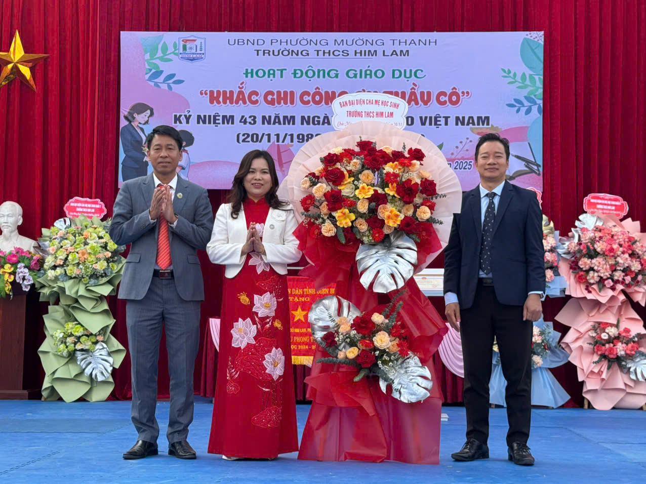 Trong không khí vui tươi, ấm áp nghĩa tình, đồng chí Đỗ Thị Thu Thủy - Ủy viên Ban chấp hành Đảng bộ tỉnh, Bí thư Đảng ủy, Chủ tịch HĐND phường Mường Thanh lên tặng hoa và chúc mừng ghi nhận những nỗ lực của tập thể cán bộ, giáo viên và học sinh trường THCS Him Lam.