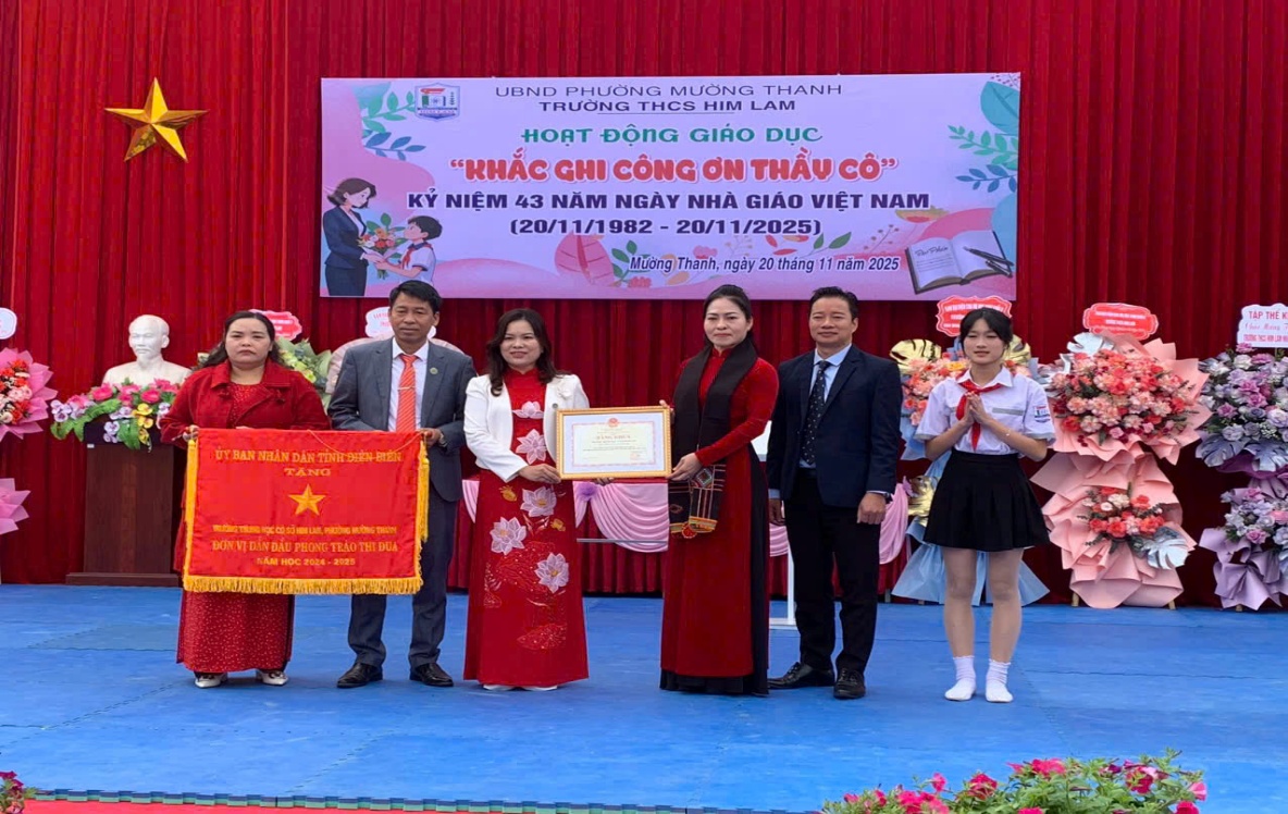 Trong phút giây sinh hoạt truyền thống đầy ý nghĩa, nhà trường vinh dự đón nhận Cờ thi đua của UBND tỉnh Điện Biên. Đặc biệt, giai đoạn 2020–2025 đánh dấu cột mốc quan trọng khi nhà trường được vinh danh là tập thể điển hình tiên tiến trong phong trào thi đua yêu nước của ngành giáo dục. Tại Hà Nội ngày 13/11/2025, nhà trường tiếp tục được Bộ Giáo dục và Đào tạo trao tặng Bằng khen về “Đổi mới, sáng tạo trong quản lý, giảng dạy và học tập”. Những phần thưởng cao quý ấy là sự ghi nhận xứng đáng cho nỗ lực bền bỉ, thành tích nổi bật trong giáo dục - đào tạo, bồi dưỡng học sinh và xây dựng môi trường học tập chất lượng. Đây cũng là nguồn động viên lớn lao để các thầy cô tiếp tục phát huy tinh thần sáng tạo, tận tâm cống hiến cho sự nghiệp trồng người.