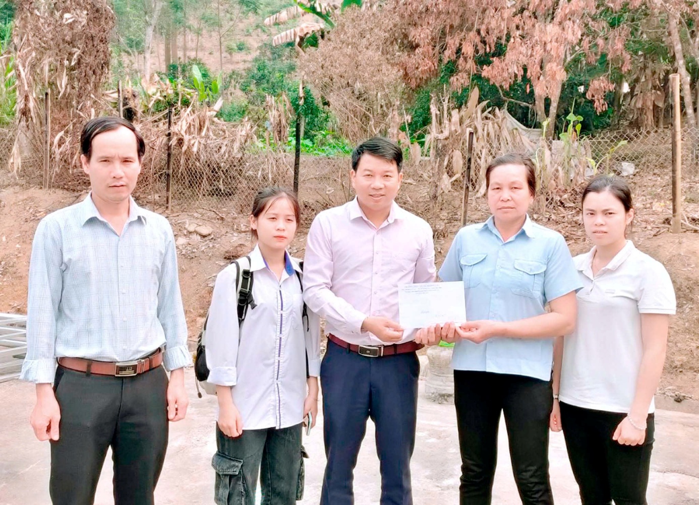 Thầy Nguyễn Văn Hải – Hiệu trưởng nhà trường, trao quà ủng hộ của toàn trường cho gia đình em Lù Thị Doanh lớp 11B3 bị cháy nhà