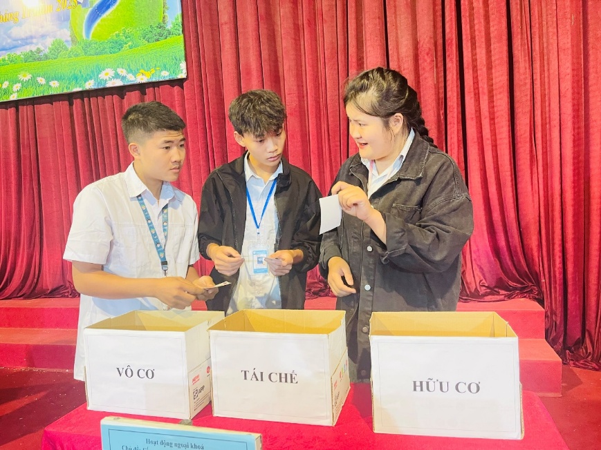 Các em học sinh đã tích cực thảo luận về quan điểm sống xanh và bảo vệ môi trường từ những hành động nhỏ hàng ngày. Ngoài ra học sinh còn được tham gia trò chơi trải nghiệm gồm 3 trạm: Trạm 1: “Phân loại rác nhanh”. Trạm 2: “Lựa chọn sản phẩm xanh”. Trạm 3: “Hoá đơn thông minh”. Trò chơi trải nghiệm giúp các em phát triển kỹ năng làm việc nhóm, thuyết trình, phản biện và sáng tạo tại buổi ngoại khoá
