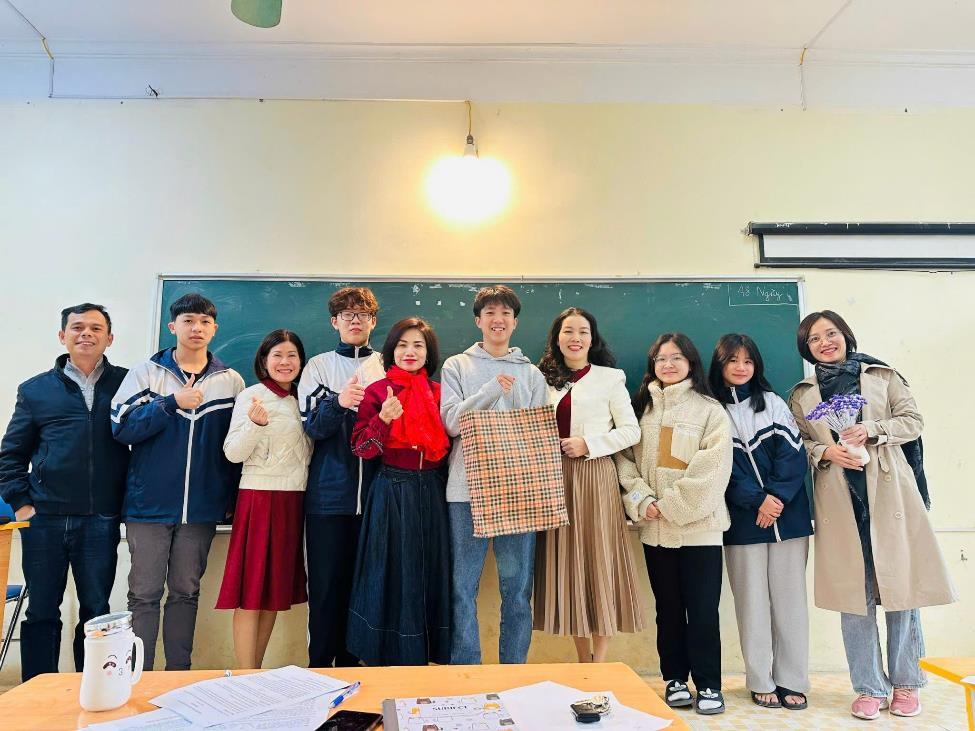 NGƯT Nguyễn Bích Ngọc (áo đỏ ở giữa) cùng thầy cô và học sinh trường THPT Chuyên Lê Quý Đôn