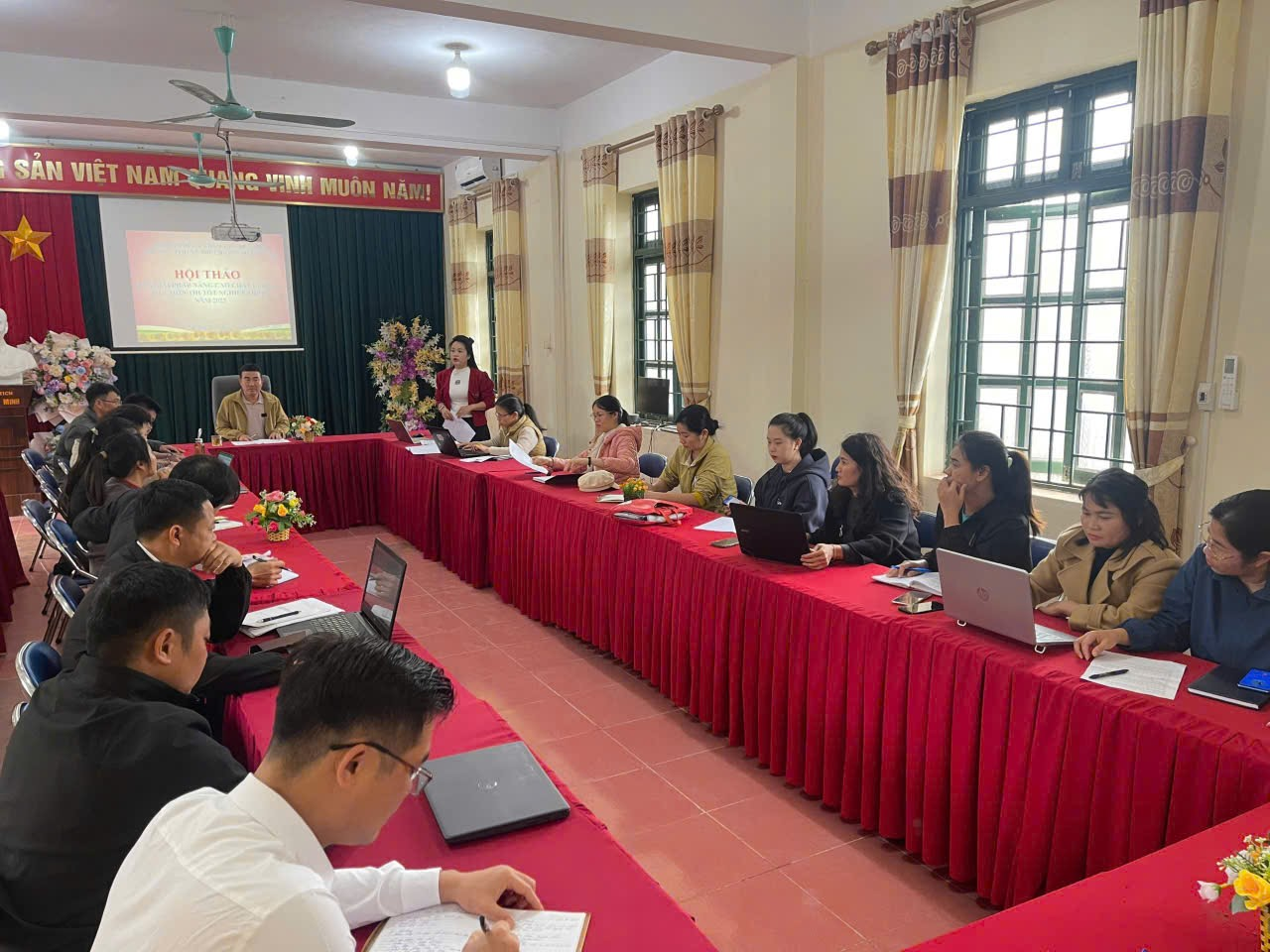 Ngay từ đầu năm học, nhà trường đã chú trọng tăng cường công tác dân chủ trong nội bộ, tạo điều kiện để mọi cán bộ, giáo viên, nhân viên được tham gia đóng góp ý kiến, bàn bạc thống nhất các chủ trương, kế hoạch, nhiệm vụ. Ban Giám hiệu tổ chức hội nghị, sinh hoạt chuyên môn định kỳ, đảm bảo mọi ý kiến đều được lắng nghe, tôn trọng và phản hồi kịp thời. Điều này không chỉ tạo sự đồng thuận, mà còn khích lệ cán bộ, giáo viên phát huy năng lực, sáng kiến trong công tác giảng dạy và quản lý học sinh.