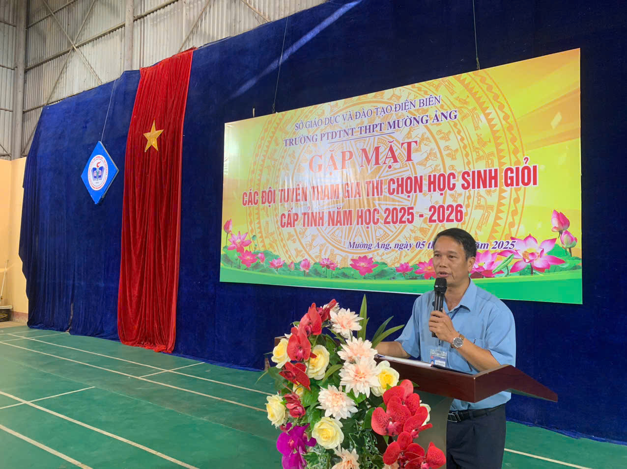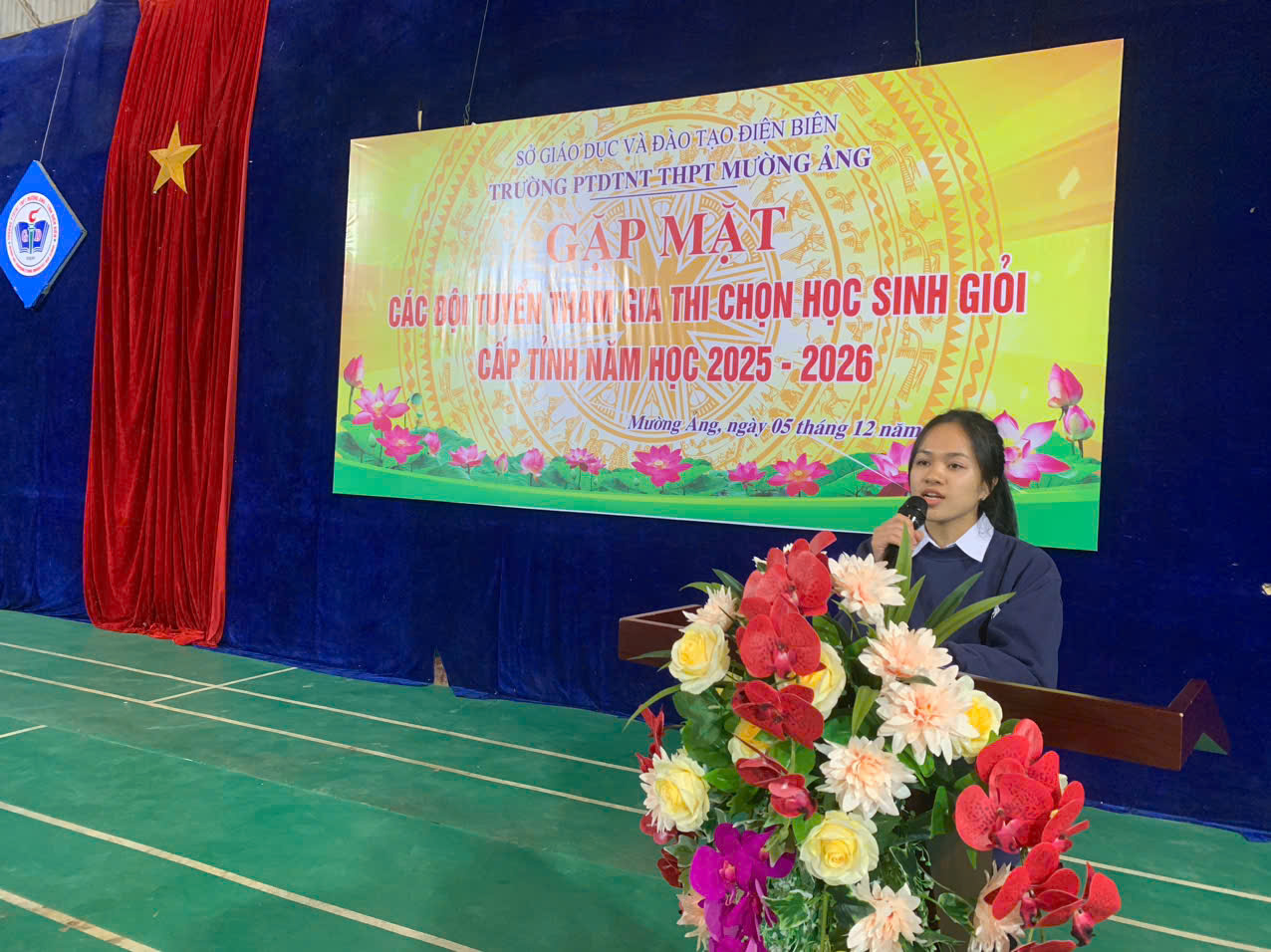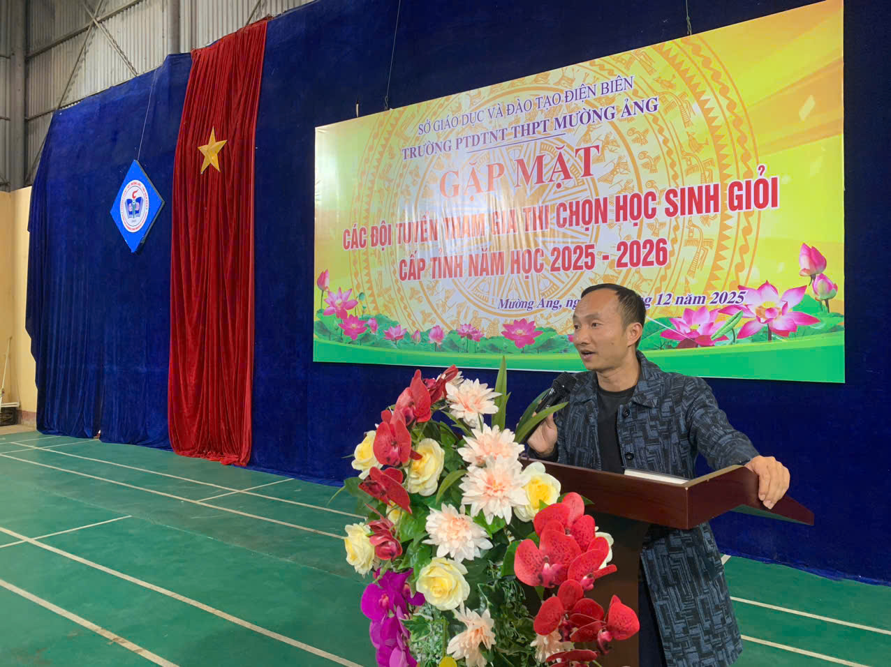 Tại buổi gặp mặt, Ban Giám hiệu và các thầy cô giáo đã gửi tới học sinh những lời chúc tốt đẹp nhất. Không khí buổi gặp mặt trở nên ấm áp hơn bởi sự quan tâm, tin tưởng mà nhà trường dành cho các em – những niềm hy vọng trẻ của Mường Ảng. Trong bài phát biểu, thầy giáo Nguyễn Thành Chi – Bí thư chi bộ, hiệu trưởng nhà trường nhấn mạnh: “Các em có mặt trong đội tuyển hôm nay đều là những học sinh tiêu biểu, đại diện cho sự nỗ lực không ngừng trong học tập. Thầy mong rằng các em sẽ giữ vững tinh thần bình tĩnh, tự tin và phát huy hết khả năng của mình. Kết quả của kỳ thi không chỉ đánh giá năng lực của bản thân mỗi em mà còn là niềm tự hào của gia đình, của thầy cô và của trường PTDTNT THPT Mường Ảng. Dù kết quả ra sao, các em đã thực sự chiến thắng chính mình trên hành trình chinh phục tri thức.” Thầy cũng gửi lời cảm ơn chân thành đến đội ngũ giáo viên bồi dưỡng đã dành nhiều thời gian, công sức và tâm huyết để đồng hành cùng học sinh, đồng thời khẳng định nhà trường luôn tạo mọi điều kiện để phát hiện, bồi dưỡng và phát triển tài năng học sinh.