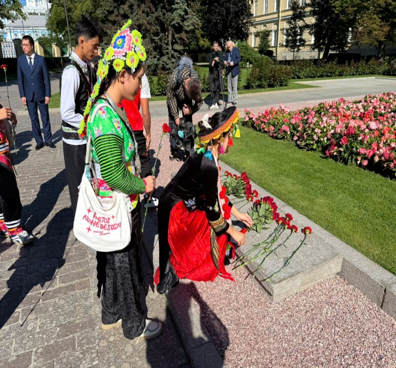 Đoàn CB, GV và học sinh trường PTDTNT THPT tỉnh Điện Biên cùng Ngài E.D.Grigoryev - Chủ tịch Ủy ban Đối ngoại Saint Petersburg dâng hoa tại Đài tưởng niệm V.I. Lênin
