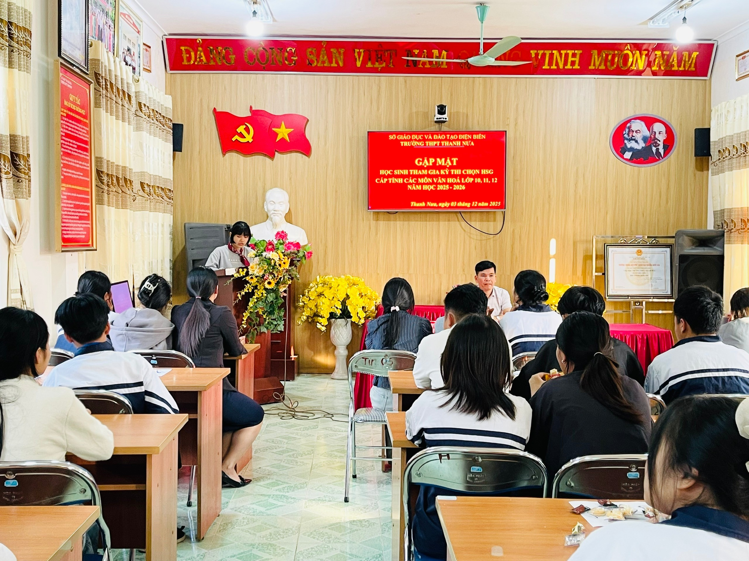 Nhằm động viên tinh thần và tạo động lực cho các em học sinh trước khi bước vào kỳ thi học sinh giỏi, chiều ngày 03/11/2025, Trường THPT Thanh Nưa đã long trọng tổ chức buổi gặp mặt đội tuyển học sinh giỏi cấp tỉnh các môn văn hoá năm học 2025-2026. Tham dự buổi gặp mặt có thầy giáo Nguyễn Thành Long - Bí thư chi bộ, Hiệu trưởng nhà trường, các thầy cô giáo trong Ban Giám hiệu, các thầy cô giáo phụ trách đội tuyển, giáo viên chủ nhiệm cùng 60 học sinh tham gia kỳ thi năm nay.