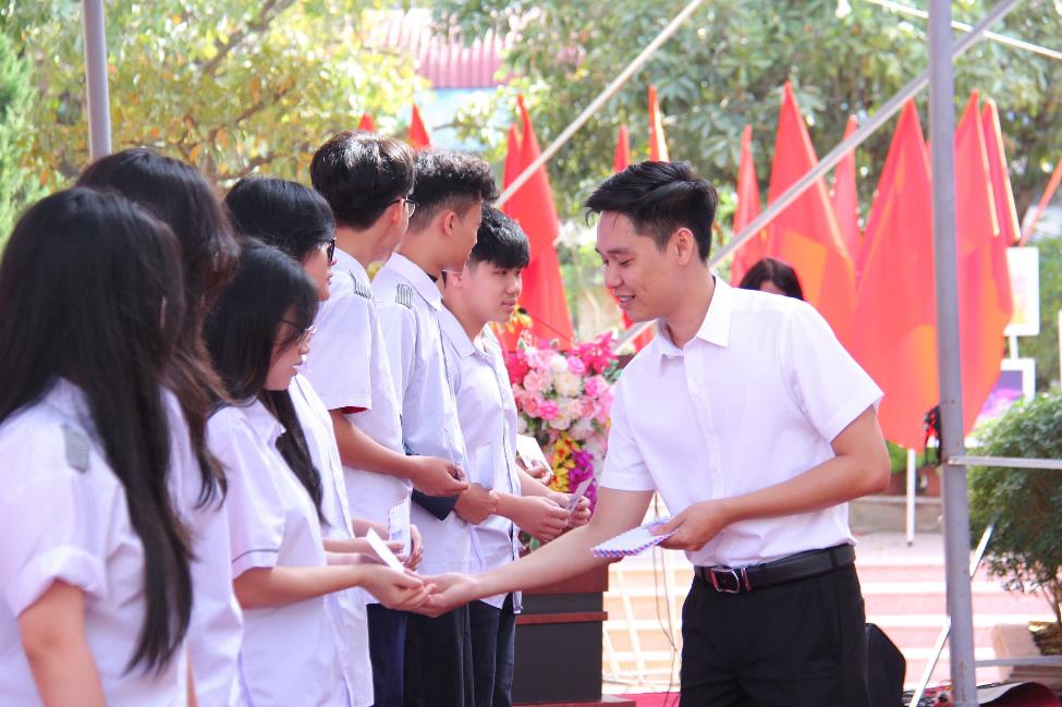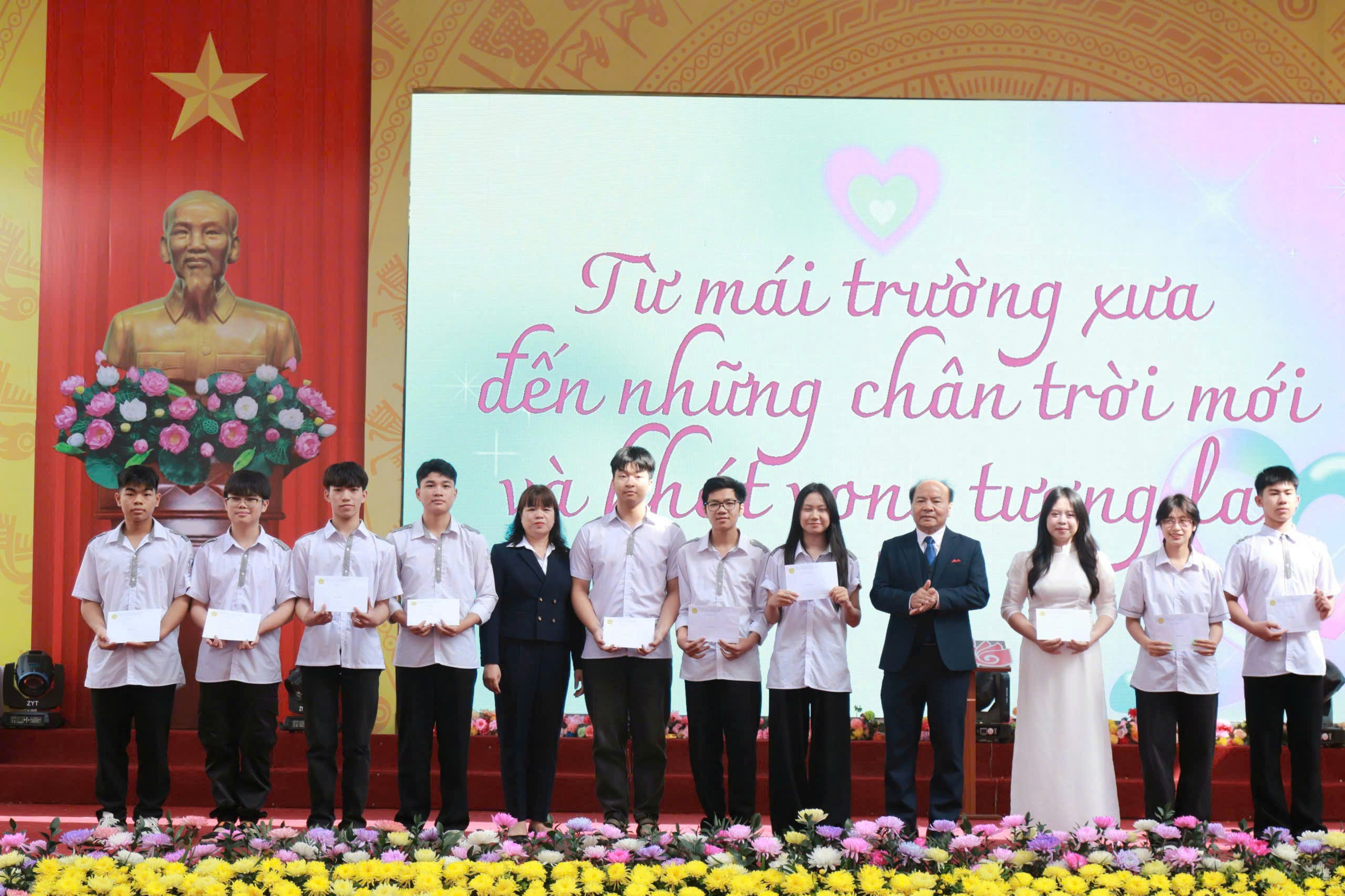 Đặc biệt, món quà của cựu học sinh Hoàng Trường Giang – một Quốc kỳ có đầy đủ dấu và chữ ký của Chỉ huy 21 đảo thuộc Quần đảo Trường Sa – mang ý nghĩa giáo dục to lớn, tiếp lửa tinh thần yêu nước và hướng về biển đảo quê hương. Những suất quà khuyến học của cựu học sinh Lưu Bảo Tuệ Minh và Tập thể lớp 12C7 lại là sự tiếp nối động lực và niềm tin, thể hiện sự quan tâm sâu sắc, mong muốn chắp cánh cho các em học sinh khóa sau vững bước trên con đường chinh phục tri thức.
