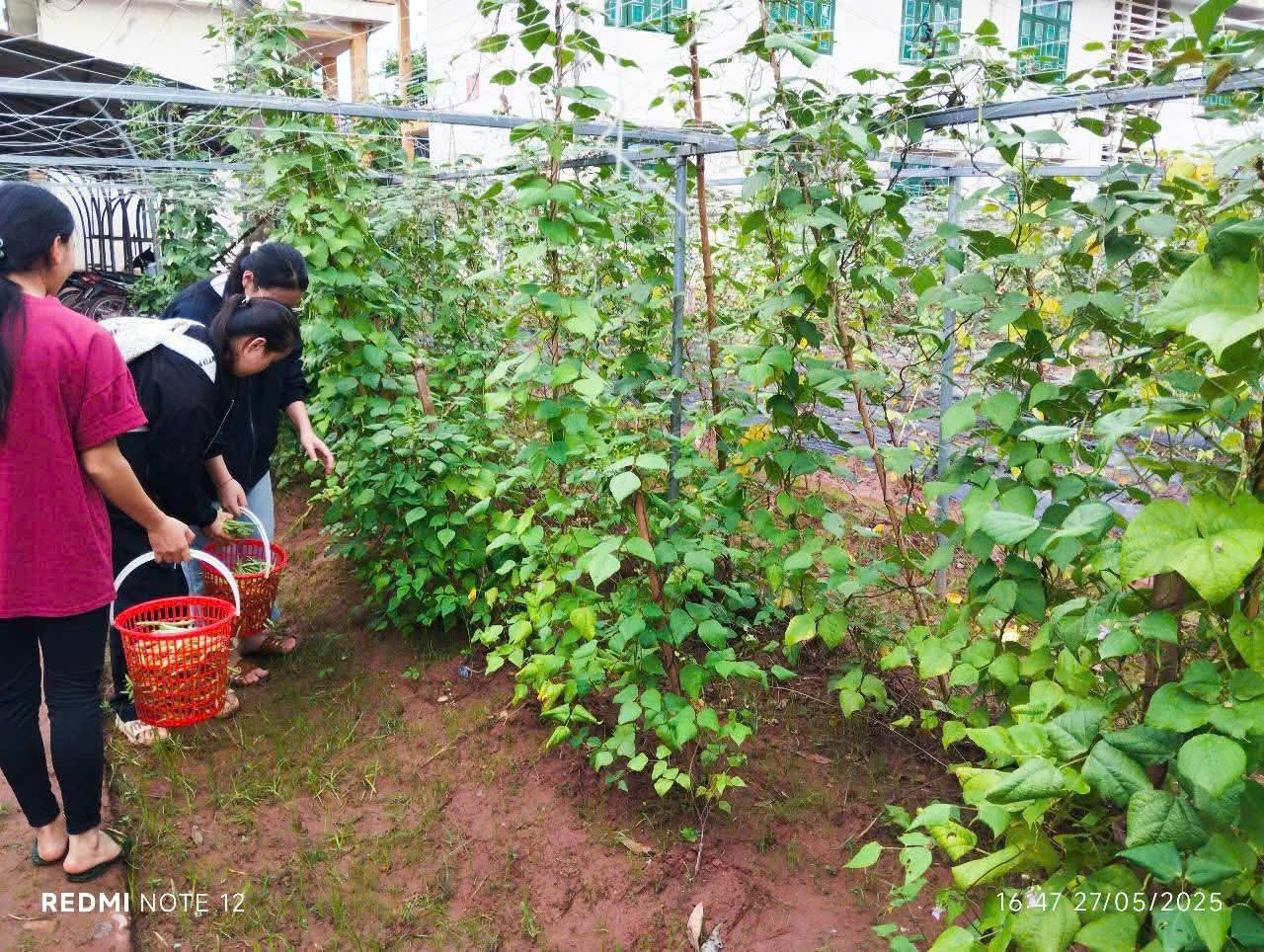 Dưới sự hướng dẫn của giáo viên chủ nhiệm và Đoàn Thanh niên, các em học sinh được trực tiếp tham gia toàn bộ quá trình chăm sóc và thu hoạch vườn rau của nhà trường. Từ những công việc cơ bản như làm đất, gieo hạt, cắm dây giàn, đến các bước chăm sóc tỉ mỉ như tỉa lá, làm cỏ, tưới nước, tất cả đều được các em thực hiện nghiêm túc và đầy hứng thú. Thành quả cuối cùng là những luống đỗ, rau xanh tươi tốt, sạch và an toàn, được đưa vào những bữa ăn hằng ngày của chính các em.