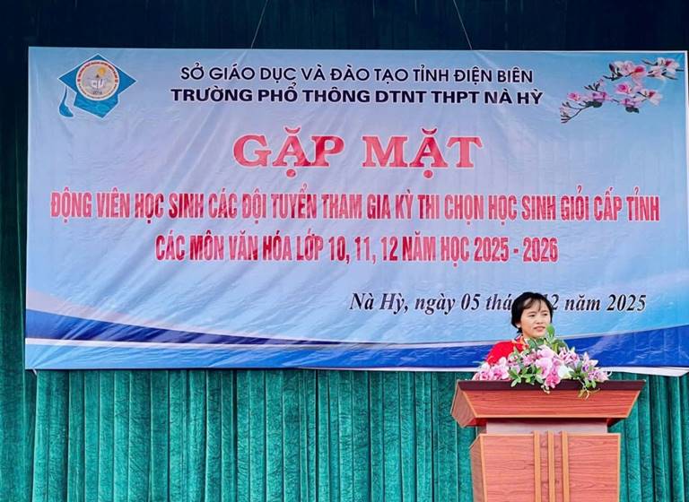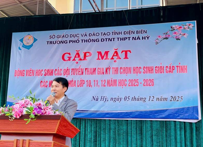 Phát biểu tại buổi gặp mặt, thầy Nguyễn Văn Tập - Bí thư chi bộ- Hiệu trưởng nhà trường đã gửi lời tri ân sâu sắc tới các thầy cô giáo lãnh đội – những người âm thầm gieo mầm tri thức, truyền lửa đam mê cho học trò bằng tất cả tâm huyết và trách nhiệm. Thầy ghi nhận sự nỗ lực bền bỉ, tinh thần vượt khó của 129 em học sinh – những gương mặt tiêu biểu đại diện cho trí tuệ và khát vọng của học sinh Nà Hỳ. Trong niềm xúc động, thầy Hiệu trưởng nhấn mạnh niềm tự hào về truyền thống giáo dục mũi nhọn của nhà trường. Trong bảy năm qua, nhà trường đã đạt tổng cộng 327 giải học sinh giỏi cấp tỉnh, trong đó có 01 giải Nhất, 06 giải Nhì, 54 giải Ba và 266 giải Khuyến khích, luôn nằm trong tốp đầu các trường về chất lượng mũi nhọn của tỉnh Điện Biên. Đó không chỉ là những con số biết nói, mà còn là kết tinh của sự hy sinh thầm lặng của các thầy cô giáo, sự nỗ lực vượt lên hoàn cảnh của học các thế hệ học trò nghèo vùng cao. Trước thời khắc quan trọng của kỳ thi, thầy Hiệu trưởng ân cần căn dặn các em giữ tâm thế bình tĩnh, tự tin, phát huy tối đa năng lực của mình; coi đây không chỉ là một kỳ thi mà còn là cơ hội để trưởng thành, để tỏa sáng, để khẳng định bản thân.