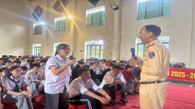 Trong phần giao lưu – phát vấn, Trung tá Phạm Hữu Hải đã tương tác trực tiếp với học sinh về quy định độ tuổi được phép điều khiển xe gắn máy, những rủi ro khi tự ý sử dụng phương tiện khi chưa đủ điều kiện theo luật định. Các câu hỏi tình huống được đưa ra giúp học sinh hiểu sâu hơn về trách nhiệm cá nhân và hậu quả của việc vi phạm trật tự an toàn giao thông.