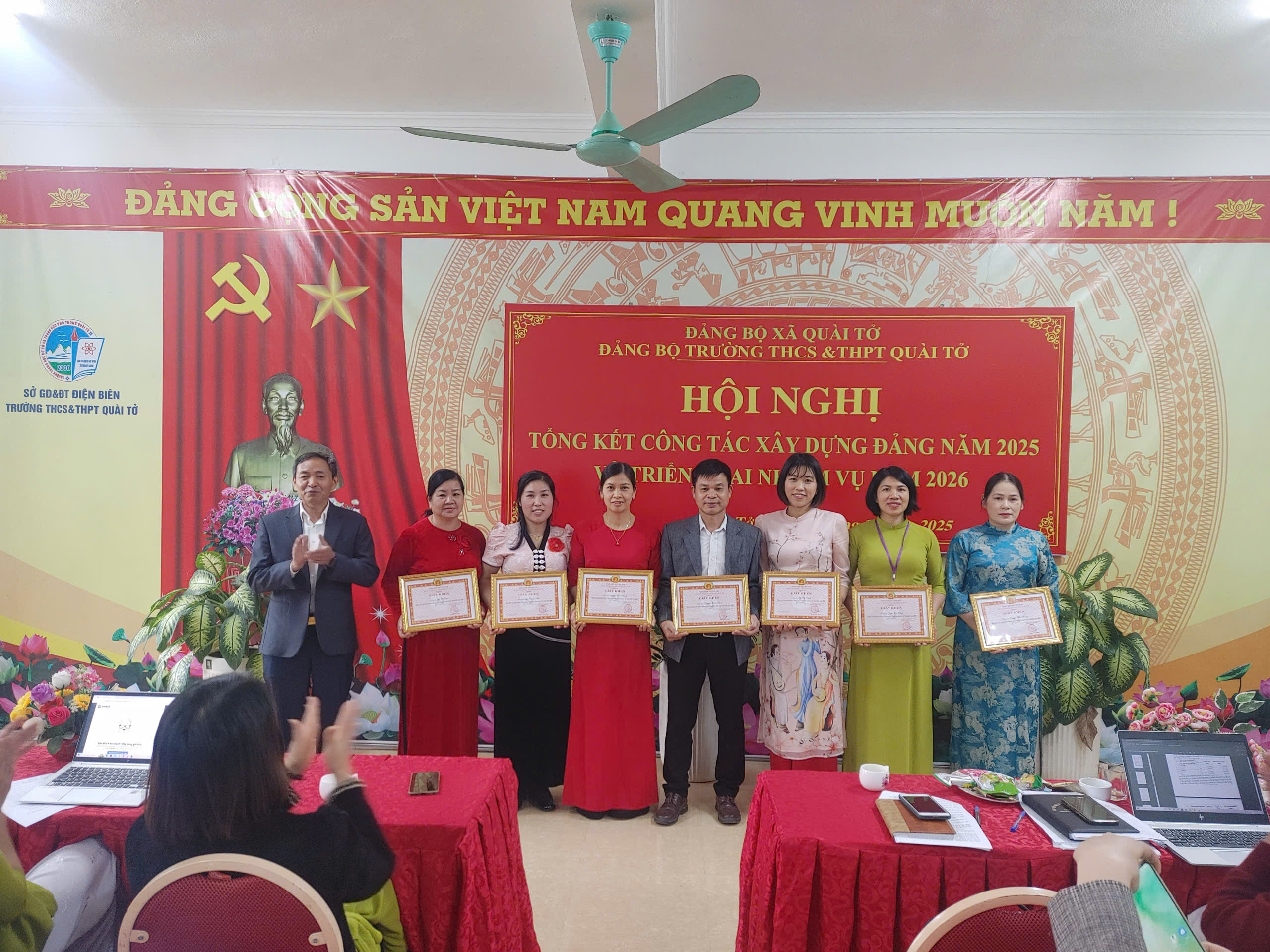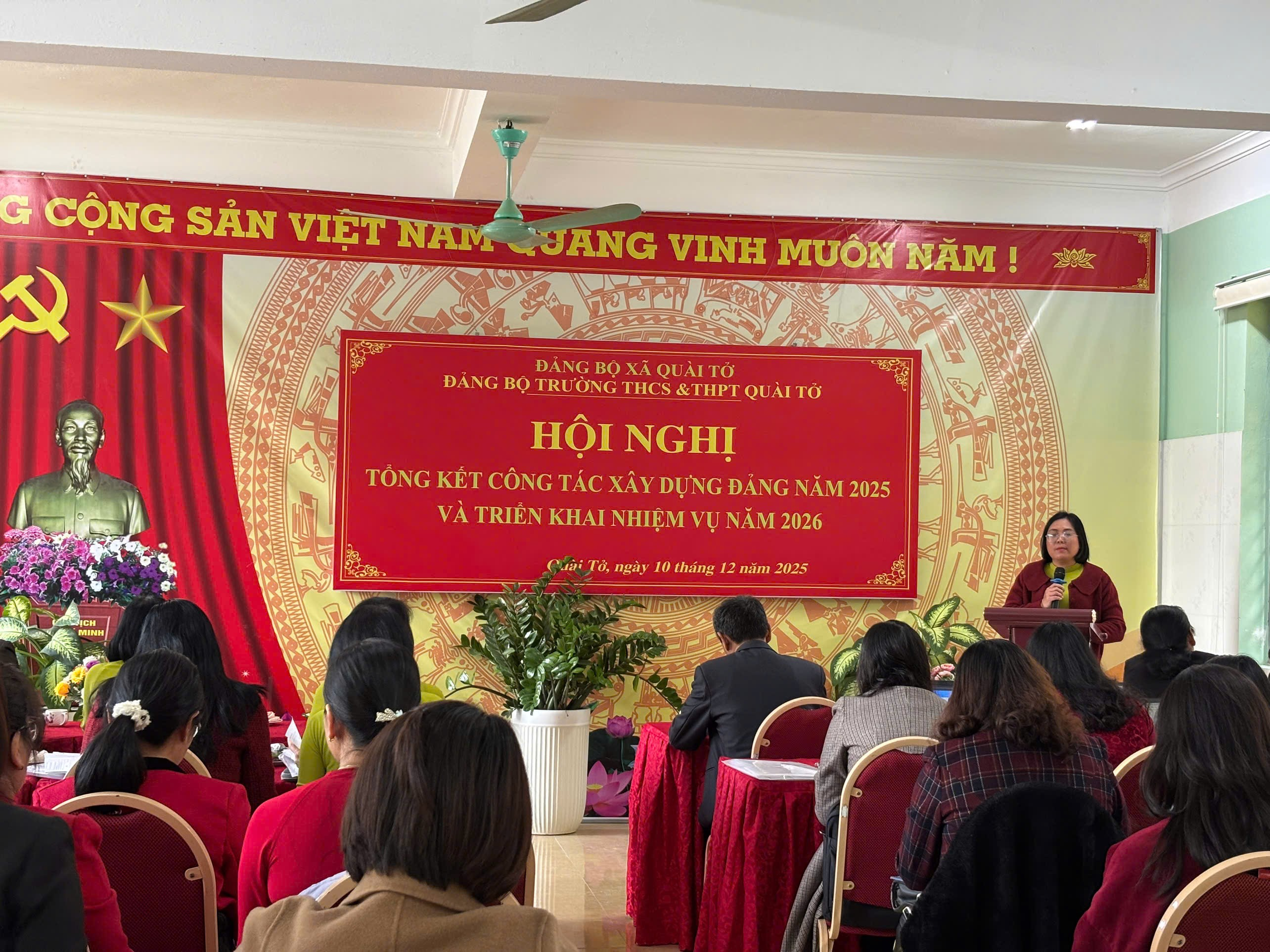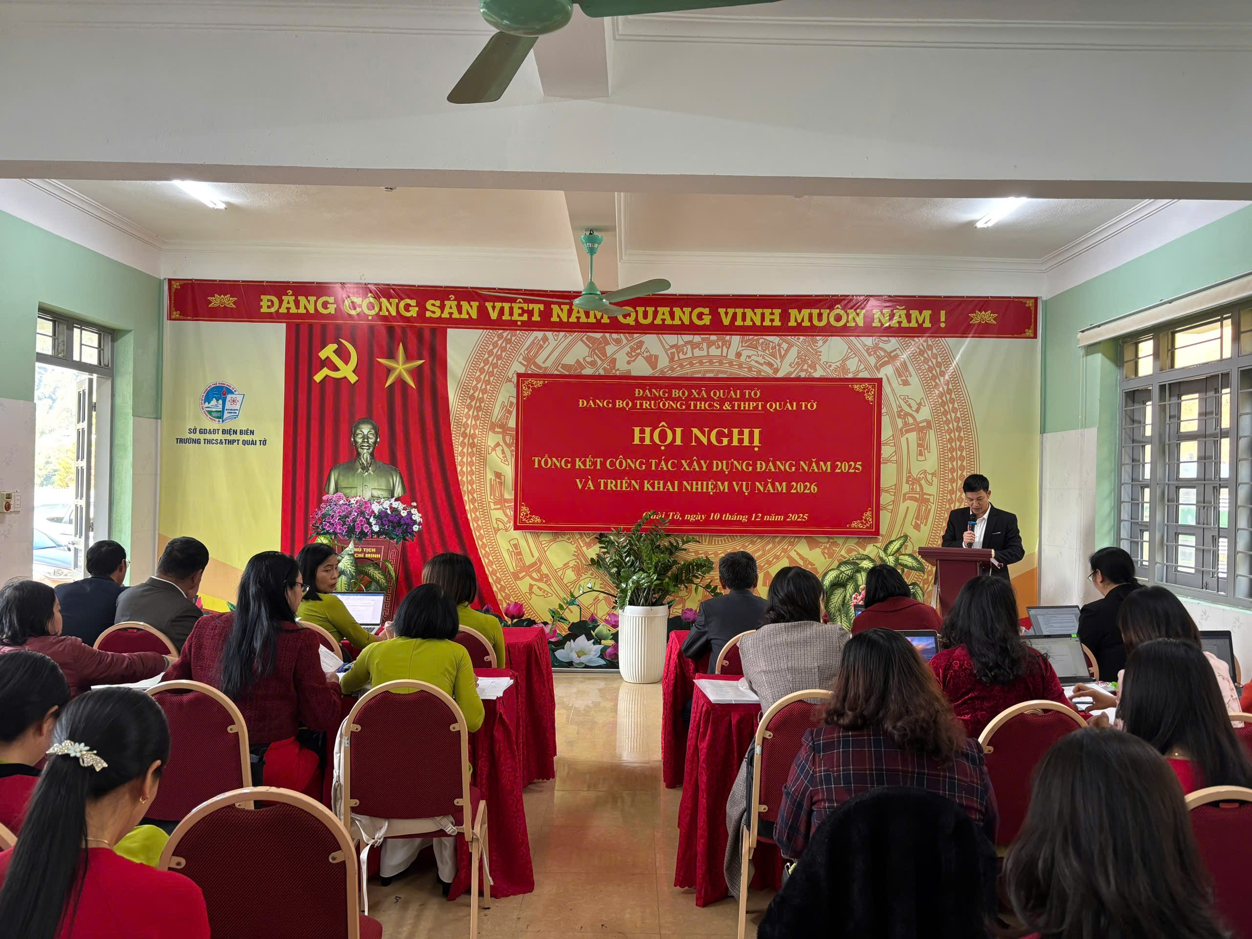 Chiều ngày 10/12/2025, tại Hội trường nhà E, Đảng ủy Trường THCS&THPT Quài Tở (xã Quài Tở, Tỉnh Điện Biên) đã tổ chức Hội nghị tổng kết công tác xây dựng Đảng năm 2025 với sự tham dự của toàn thể 43 đảng viên nhà trường và đại biểu khách mời. Hội nghị được tổ chức nhằm đánh giá kết quả thực hiện nhiệm vụ chính trị trong năm, đồng thời đề ra định hướng lãnh đạo cho năm 2026.