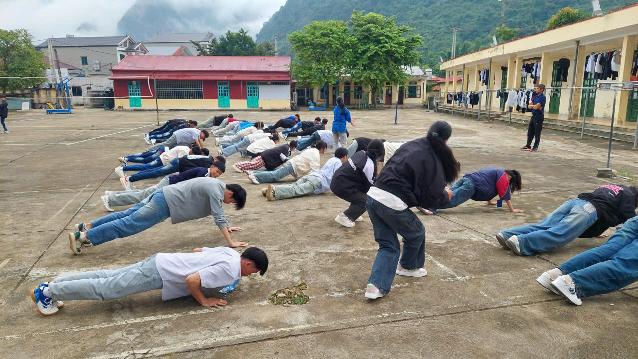 Phần khởi động trong giờ học thể dục trên sân trường sạch đẹp khu nội trú