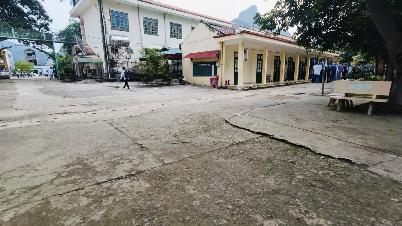 Sân nội trú đã được quét dọn vào sáng sớm, các em bắt đầu lên lớp học