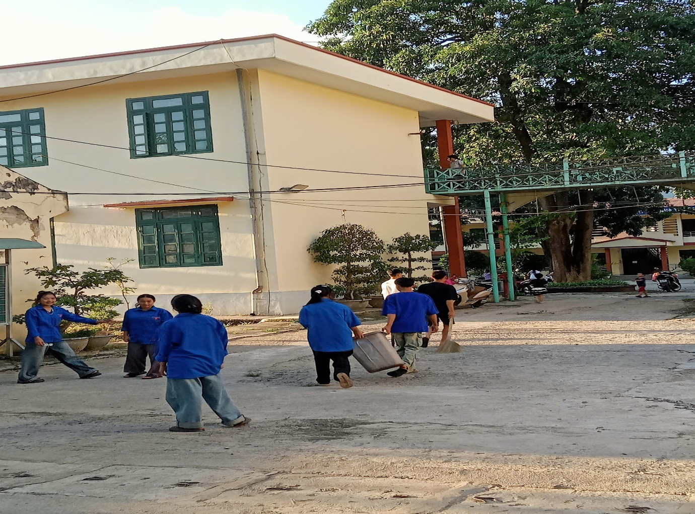Sau những giờ học căng thẳng, khi nắng chiều đã dịu, các em học sinh nội trú lại tiếp tục phát huy tinh thần trách nhiệm của mình. Từ 17h đến 18h, các em cùng nhau quét dọn sân trường, rửa dội các khu nhà vệ sinh sạch sẽ, góp phần giữ gìn môi trường sinh hoạt chung luôn sạch đẹp, an toàn.