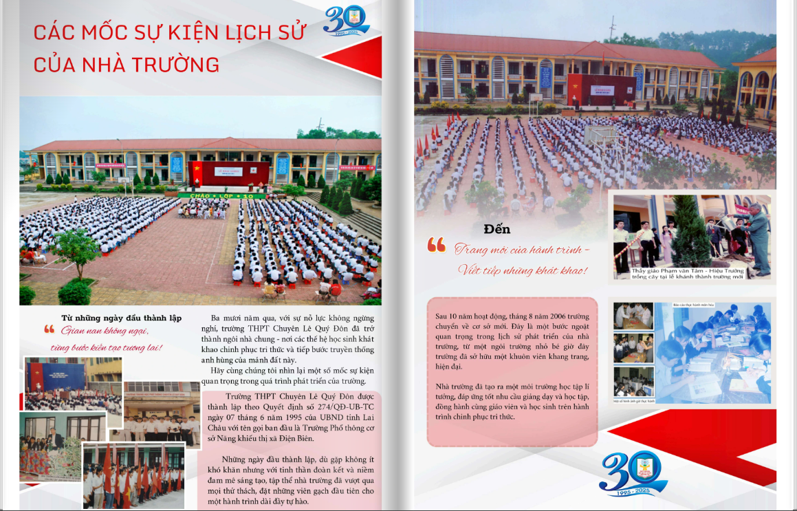 Phần I: Dòng chảy lịch sử: Bao gồm "Lời ngỏ" của Ban Biên soạn, "Thư chúc mừng" của lãnh đạo tỉnh Điện Biên, cùng các bài viết về mốc son tự hào, sứ mạng, tầm nhìn, giá trị cốt lõi và các mốc sự kiện lịch sử của Nhà trường.