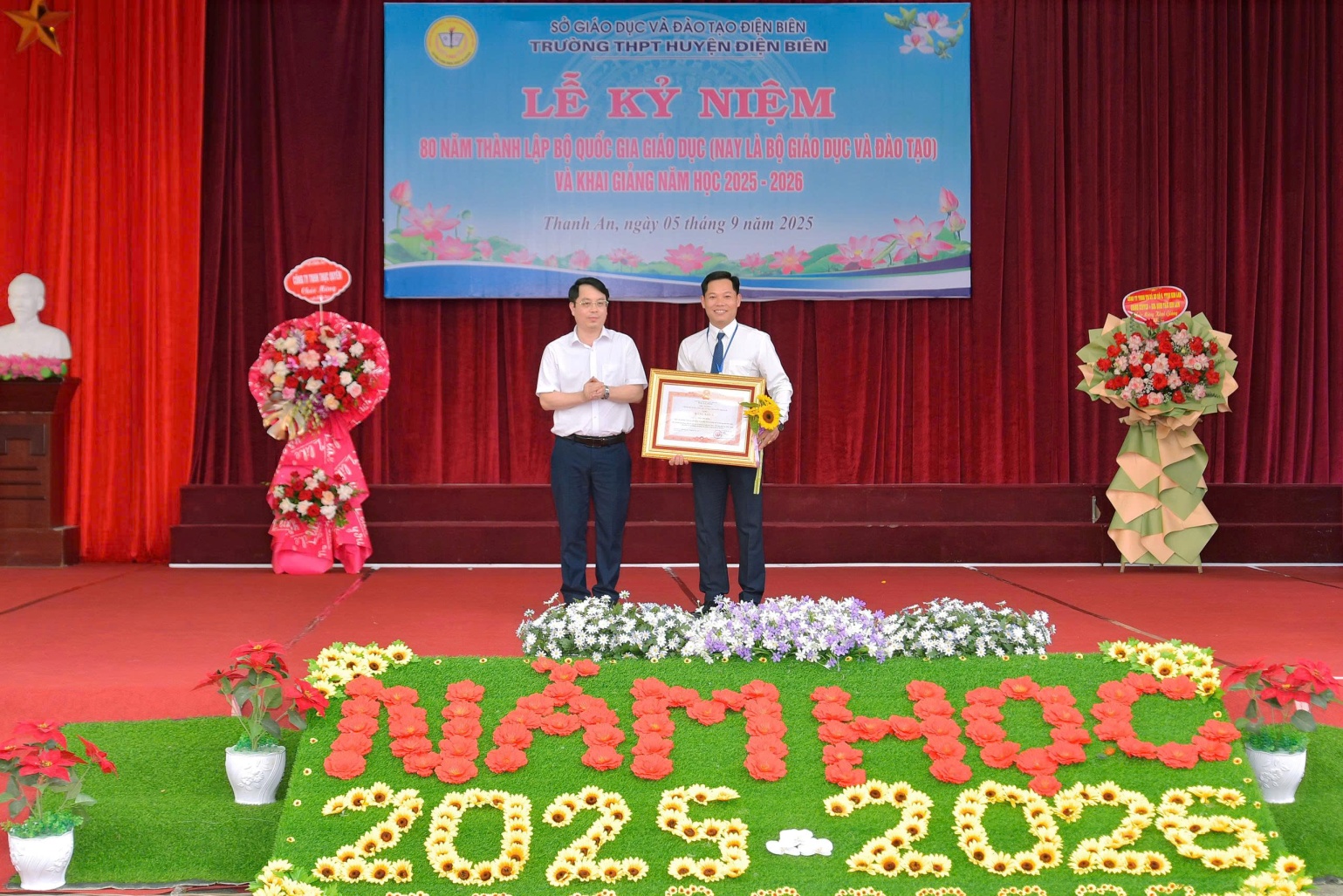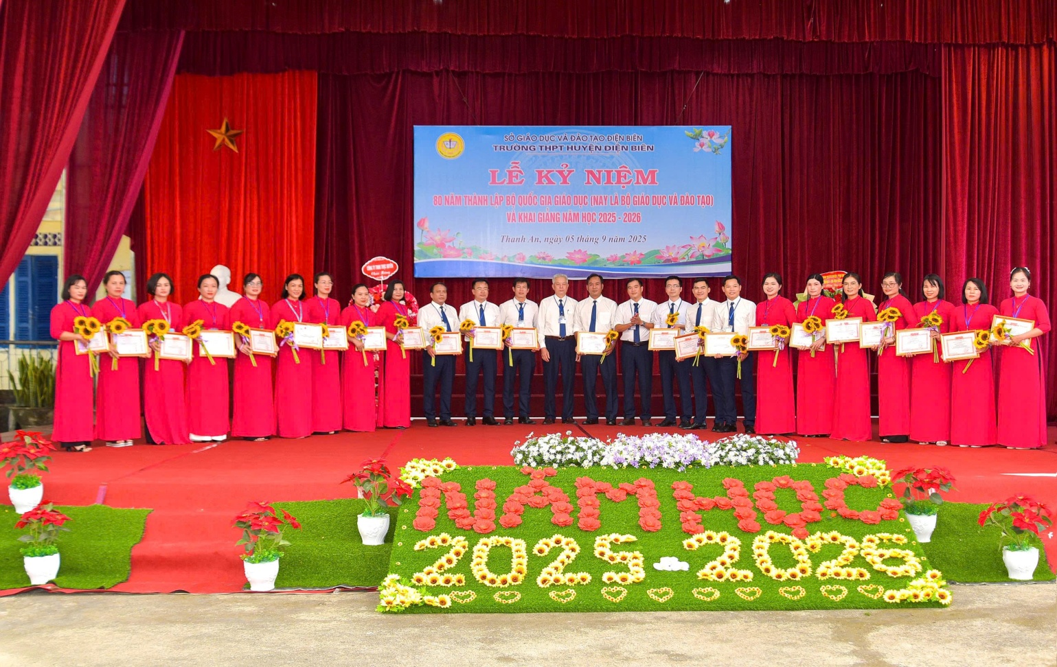 Cũng nhân dịp này, nhằm nêu gương những điển hình tiêu biểu trong sự nghiệp đào tạo, nhà trường tổ chức trang trọng nghi thức trao bằng khen, giấy khen cho các các nhân có thành tích xuất sắc. Năm học 2024-2025 nhà trường vinh dự có thầy giáo Trần Thế Dũng – giảng dạy bộ môn Toán được nhận bằng khen của thủ tướng chính phủ; Nguyễn Thị Cúc – giảng dạy bộ môn Địa lý nhận bằng khen của Bộ GD&ĐT; Cô giáo Nguyễn Thị Lan Anh – giảng dạy bộ môn Toán nhận bằng khen của chủ tịch UBND tỉnh Điện Biên; Có 03 thầy cô nhận giấy khen của giám đốc Sở GD&ĐT, 29 thầy cô đạt fanh hiệu chiến sĩ thi đua cơ sở. Tại buổi lễ nhà trường trang trọng trao học bổng cho các em học sinh đạt thanh tích cao, đặc biệt là các cá nhân đạt điểm 10 trong kì thi tốt nghiệp THPT năm 2025 nhận quà chúc mừng của thầy giáo Phạm Vân Hùng – nguyên quyền hiệu trưởng nhà trường giai đoạn 1991-1996.