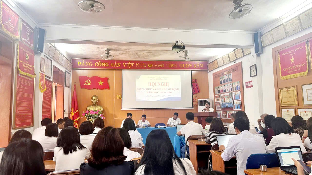 Năm học 2024-2025 tập thể nhà trường đã đạt và vượt các chỉ tiêu đề ra; đạt nhiều kết quả nổi bật, vượt bậc trong thực hiện nhiệm vụ năm học, cụ thể: Thi học sinh giỏi cấp tỉnh đạt 62 giải (01 giải Nhì, 21 giải Ba, 40 giải Khuyến khích tăng 08 giải so với năm học trước). Thi KHKT cấp tỉnh đạt 02 giải (01 Ba; 01 giải Tư). Thi Tốt nghiệp THPT đạt 100%, đạt chỉ tiêu đề ra và cao hơn so với mặt bằng chung toàn tỉnh là 0,18 (99,82%), điểm trung bình đứng thứ 14/44 toàn tỉnh. Tham gia Hội thao truyền thống đạt 01 giải Nhất cờ vua nam, 01 giải Ba bóng chuyền nữ, 01 giải Ba đôi Nam lãnh đạo, 1 giải Ba đôi nữ Pickleball, 1 giải Ba cờ vua nữ. Tham gia giải bóng đá Thanh niên huyện đạt 01 giải Ba môn bóng đá nam. Tham gia giải bóng chuyền Công - Nông - Binh huyện đạt 01 giải Ba nam. Tham gia giải Pickleball Công nông binh của ngành đạt giải Nhì. Tham gia Giải Hội thao khối phổ thông lần 2, năm 2025 đạt 01giải Nhì bóng bàn đôi nữ, 02 giải Ba cờ vua. Tham gia trường học không ma túy đạt giải Ba toàn đoàn và giải Nhất phần thi hùng biện. Tham gia Hội thi các câu lạc bộ Tiếng Anh tỉnh Điện Biên, lần thứ nhất do tỉnh Đoàn Điện Biên tổ chức đạt giải Nhất phần thi Rung chuông vàng và giải Nhì phần thi hùng biện. Tham gia Cuộc thi an toàn giao thông cho nụ cười ngày mai do Bộ GD&ĐT và Bộ Công an phối hợp tổ chức, đạt 01 giải Ba cấp quốc gia. 100% giáo viên đạt chuẩn và trên chuẩn nghề nghiệp; 100% Giáo viên, nhân viên được đánh giá Hoàn thành xuất sắc và hoàn thành tốt nhiệm vụ. Đặc biệt năm học vừa qua nhà trường vinh dự có nhiều cá nhân được các cấp ghi nhận và tặng thưởng: 02 cá nhân được tặng thưởng Huân chương Lao động hạng Ba; 03 cá nhân được tặng thưởng Bằng khen của Thủ tướng chính phủ; 02 cá nhân được tặng Bằng khen của UBND tỉnh, 03 cá nhân được tặng giấy khen của Giám đốc Sở GD&ĐT; 25 cá nhân đạt danh hiệu CSTĐCS. Trên cơ sở thành tích đật được Hội nghị đã thẳng thắn chỉ ra những hạn chế, khuyết điểm cần khắc phục, đồng thời thống nhất phương hướng, nhiệm vụ và các giải pháp trọng tâm, đột phá cho năm học mới. Đồng chí đã thay mặt cấp uỷ, Ban giám hiệu nhà trường ghi nhận và biểu dương tinh thần nỗ lực, sáng tạo của toàn thể cán bộ, giáo viên, nhân viên trong việc duy trì nền nếp, kỷ cương, đổi mới phương pháp dạy học và không ngừng nâng cao chất lượng giáo dục toàn diện, xây dựng tập thể nhà trường đoàn kết thống nhất, luôn quan tâm chia sẻ giúp đỡ đồng nghiệp học sinh.