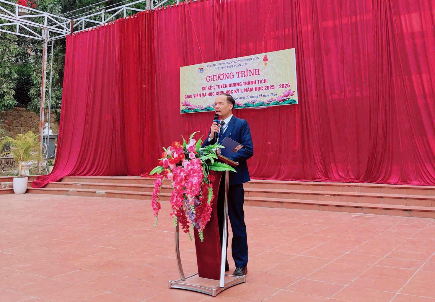 Đồng chí Bùi Trung Thành – Hiệu trưởng Trường THPT Tuần Giáo báo cáo tóm tắt kết quả sơ kết học kỳ I và triển khai nhiệm vụ trọng tâm học kỳ II năm học 2025–2026