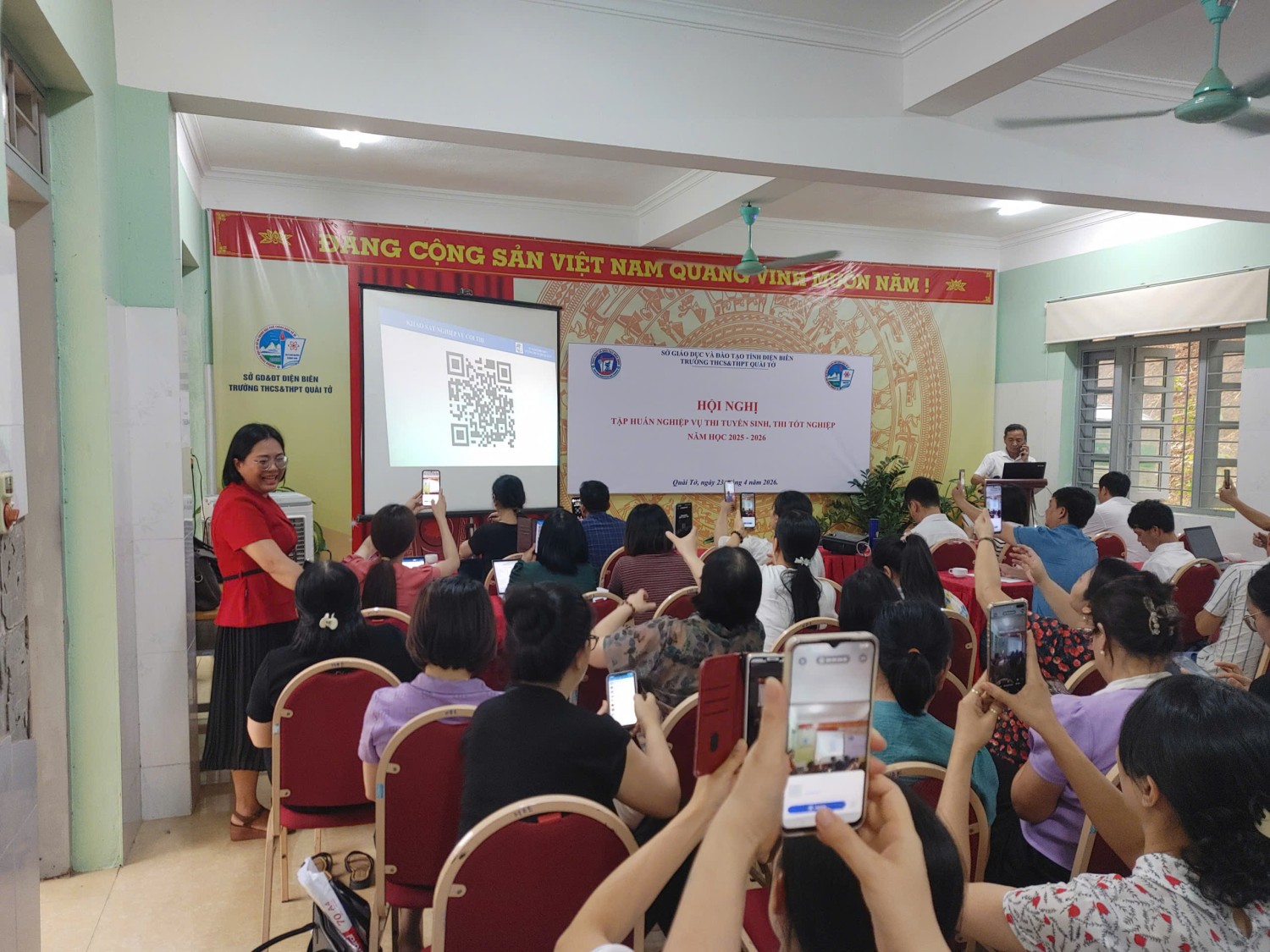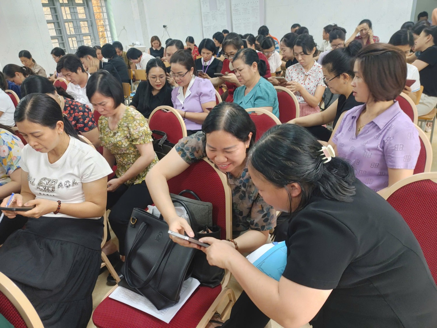 Điểm nhấn đáng chú ý của hội nghị là hoạt động khảo sát nội dung tập huấn được triển khai ngay sau phần học tập chuyên môn. Các giáo viên đã trực tiếp sử dụng điện thoại thông minh có kết nối internet để tham gia làm bài khảo sát, qua đó kiểm tra mức độ tiếp thu, nắm bắt quy chế và nghiệp vụ thi. Hình thức này không chỉ tạo sự chủ động, hứng thú cho người tham gia mà còn thể hiện rõ định hướng tăng cường ứng dụng công nghệ thông tin trong công tác tập huấn và quản lý giáo dục.