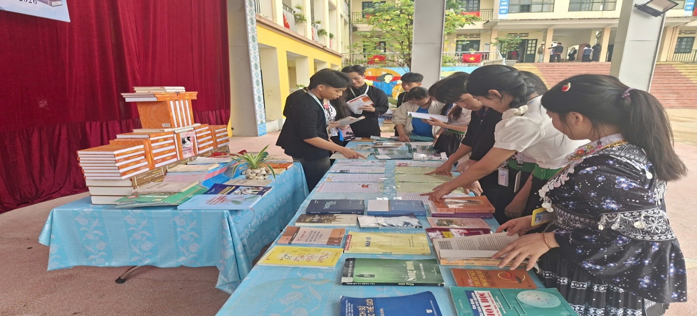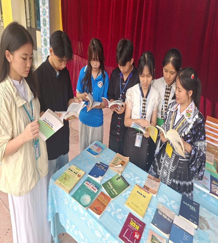 Bên cạnh đó, nhà trường đã phối hợp với Thư viện tỉnh Điện Biên tổ chức hoạt động xe thư viện lưu động, mang đến hàng trăm đầu sách đa dạng, hấp dẫn. Hoạt động này không chỉ giúp học sinh có cơ hội tiếp cận nguồn tài liệu phong phú mà còn tạo không khí học tập mới mẻ, khơi dậy niềm đam mê đọc sách trong môi trường học đường. Câu lạc bộ truyền thông đã tuyên truyền về mục đích, ý nghĩa của Ngày Sách và văn hóa đọc Việt Nam trên loa phát thanh thanh niên của nhà trường.