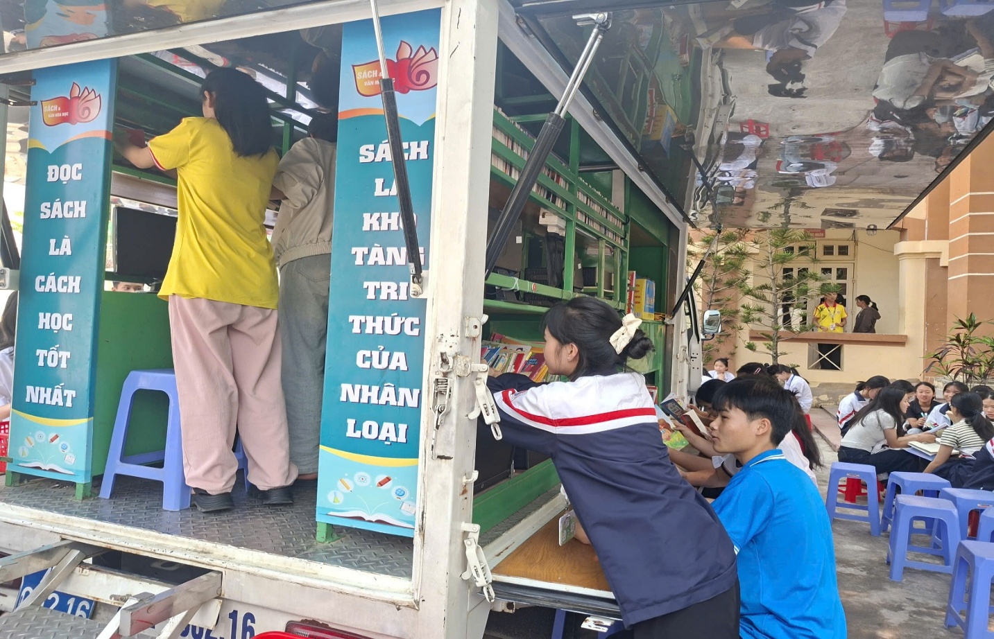 Hình ảnh học sinh đọc sách tại xe lưu động của Thư viện tỉnh Điện Biên