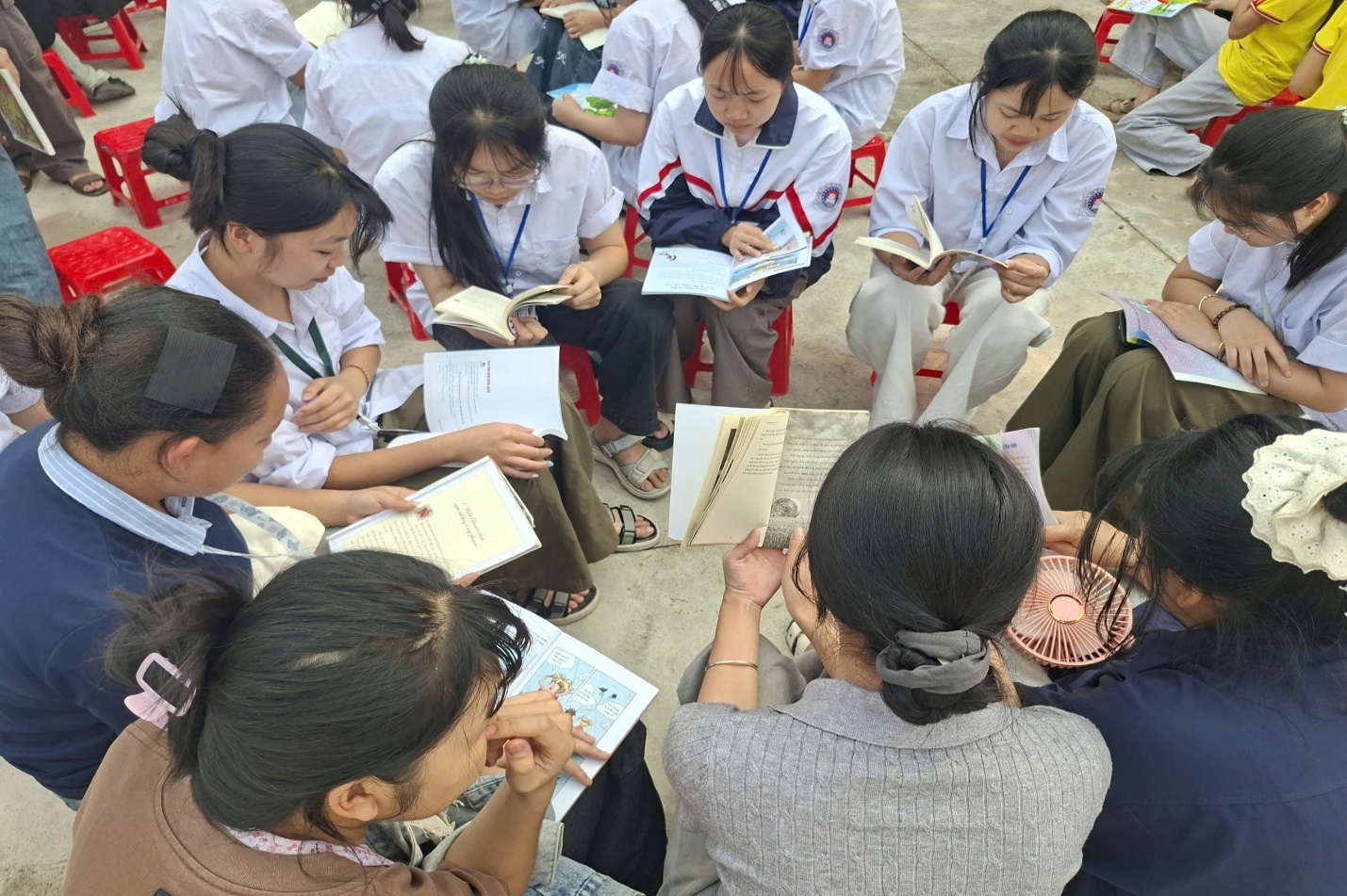 Hình ảnh các em học sinh đọc sách tại khu trưng bày sách