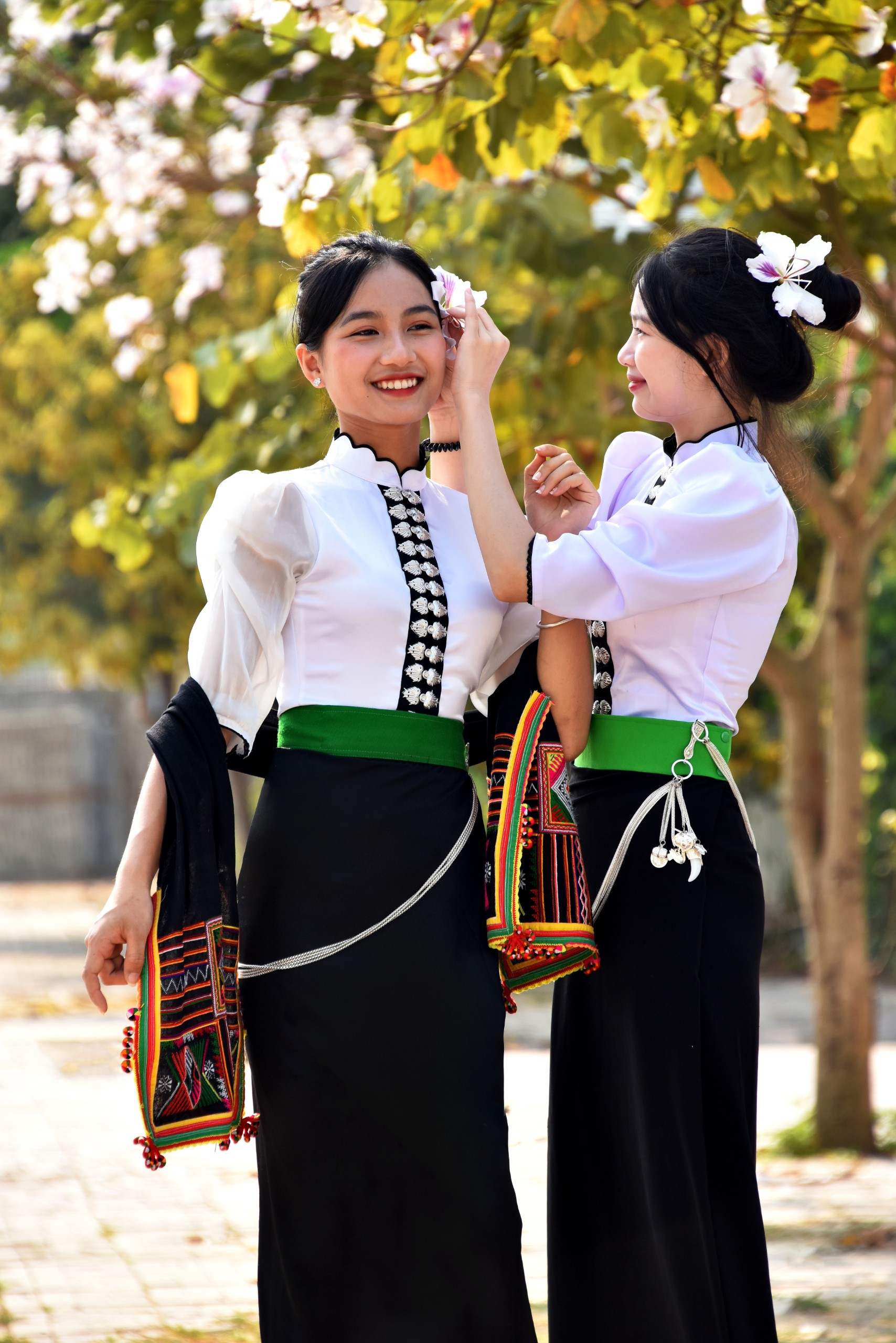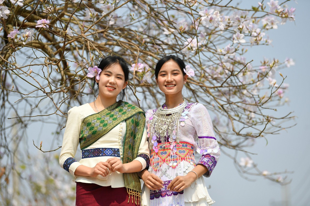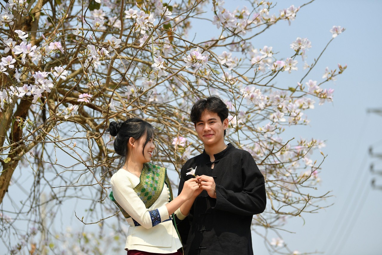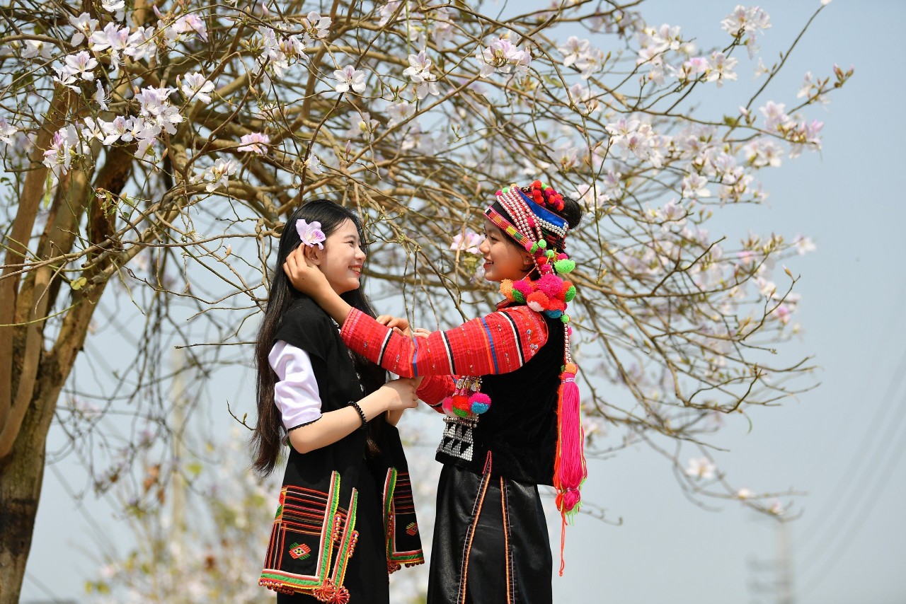 Học sinh Trường PTDTNT THPT tỉnh Điện Biên chụp ảnh cùng hoa ban khoe sắc