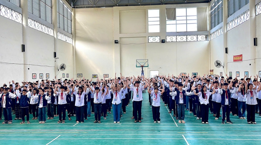 Điểm nhấn nổi bật của chương trình là màn đồng diễn “Hát vang trong kỷ nguyên mới” với sự tham gia của toàn thể học sinh khối THCS. Trong nền nhạc sôi động, các động tác được thực hiện đồng đều, dứt khoát, thể hiện sự luyện tập nghiêm túc và tinh thần kỷ luật cao.