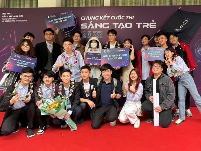 Tuấn Đạt (ngồi thứ 3 từ trái sang) tại cuộc thi “ Sáng tạo trẻ năm 2022” Đại học Bách Khoa Hà Nội tổ chức