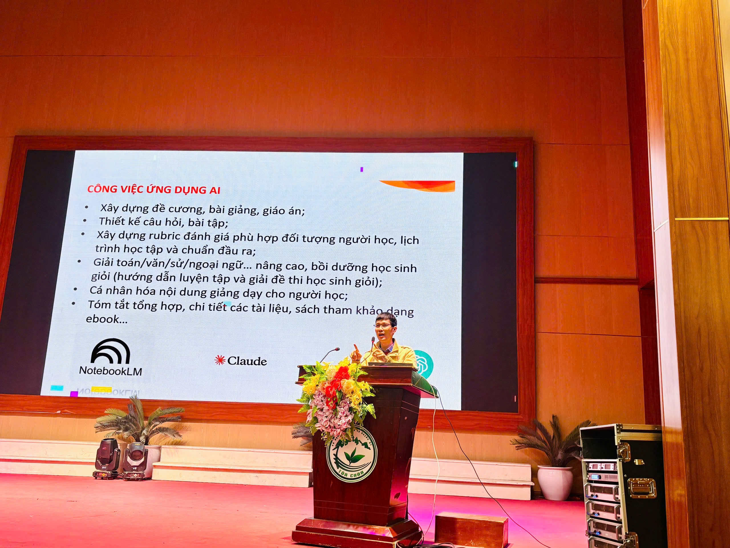 Tại buổi sinh hoạt, Tiến sĩ Lê Trung Thực đã trình bày chuyên đề “Tổng quan về Learning Ecosystem và ứng dụng trí tuệ nhân tạo (AI) trong giảng dạy”, cung cấp những nội dung cơ bản về mô hình hệ sinh thái học tập hiện đại, vai trò của giáo viên trong bối cảnh giáo dục số; đồng thời giới thiệu các giải pháp, công cụ AI hỗ trợ thiết kế bài giảng, xây dựng học liệu số, kiểm tra, đánh giá và cá nhân hóa hoạt động học tập của học sinh. Báo cáo cũng nhấn mạnh yêu cầu sử dụng AI đúng mục đích, bảo đảm an toàn dữ liệu và đạo đức nghề nghiệp trong nhà trường.