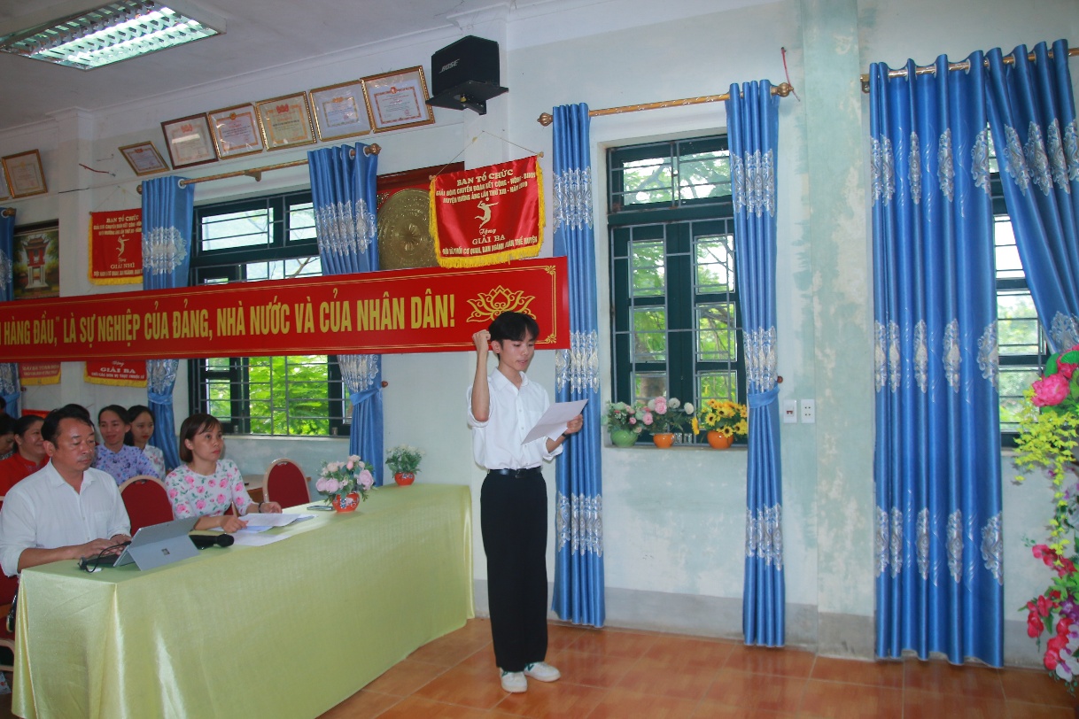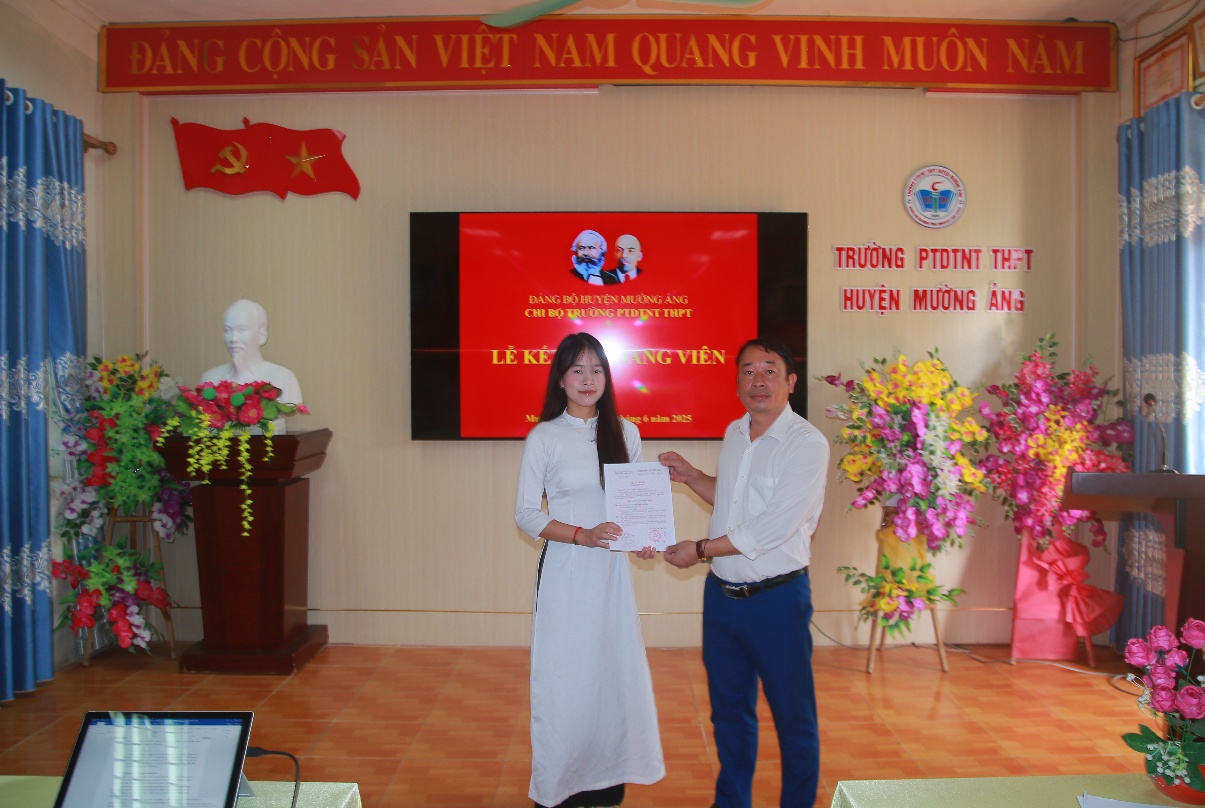 Dienbien.edu.vn – Chiều ngày 28/6/2024, tại Trường Phổ thông Dân tộc nội trú THPT huyện Mường Ảng, Chi bộ nhà trường đã long trọng tổ chức Lễ kết nạp Đảng viên mới cho hai quần chúng ưu tú là em Cầm Nhân Huy và em Trịnh Thị Chính Tâm – học sinh lớp 12, theo Quyết định số 3846-QĐ/HU và 3847-QĐ/HU ngày 23/6/2025 của Huyện ủy Mường Ảng. Buổi lễ diễn ra trong không khí trang nghiêm, đúng trình tự, thủ tục theo Điều lệ Đảng, với sự tham dự đầy đủ của các đồng chí đảng viên trong Chi bộ. Việc kết nạp hai học sinh ưu tú vào hàng ngũ của Đảng Cộng sản Việt Nam là dấu mốc quan trọng, đánh dấu sự trưởng thành về tư tưởng, nhận thức và bản lĩnh chính trị của các em.