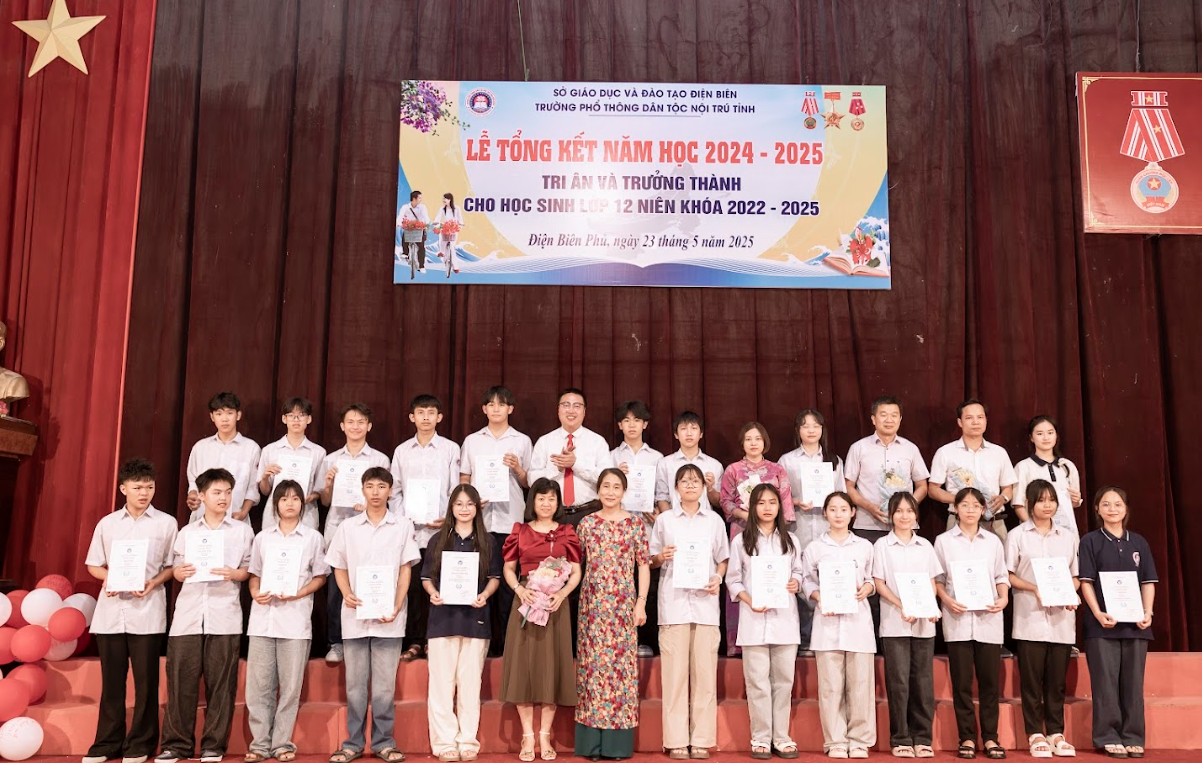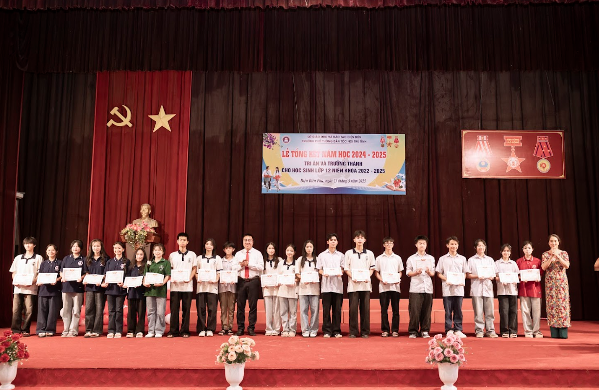 Những vần thơ như khúc nhạc ngọt ngào, ngân vang giữa sân trường, làm lòng người chợt chùng lại. Trong ánh nắng tháng Năm chan hòa ấy, từng hàng ghế học trò như lặng đi, đong đầy những cảm xúc khó gọi thành tên. Mỗi tiếng ve, mỗi cánh phượng như lời thì thầm tiễn biệt, vừa là dấu hiệu của sự kết thúc, vừa là lời hứa hẹn cho một hành trình mới - hành trình trưởng thành. Tối ngày 23/5/2025, trong không gian đầy ắp yêu thương và lưu luyến, Trường PTDTNT tỉnh Điện Biên đã long trọng tổ chức Lễ tổng kết năm học 2024-2025, Tri ân và Trưởng thành cho học sinh lớp 12 niên khóa 2022-2025. Buổi lễ vinh dự có sự hiện diện của Ban Giám hiệu nhà trường, Ban đại diện cha mẹ học sinh, các bậc phụ huynh cùng toàn thể cán bộ, giáo viên, nhân viên và học sinh của nhà trường.