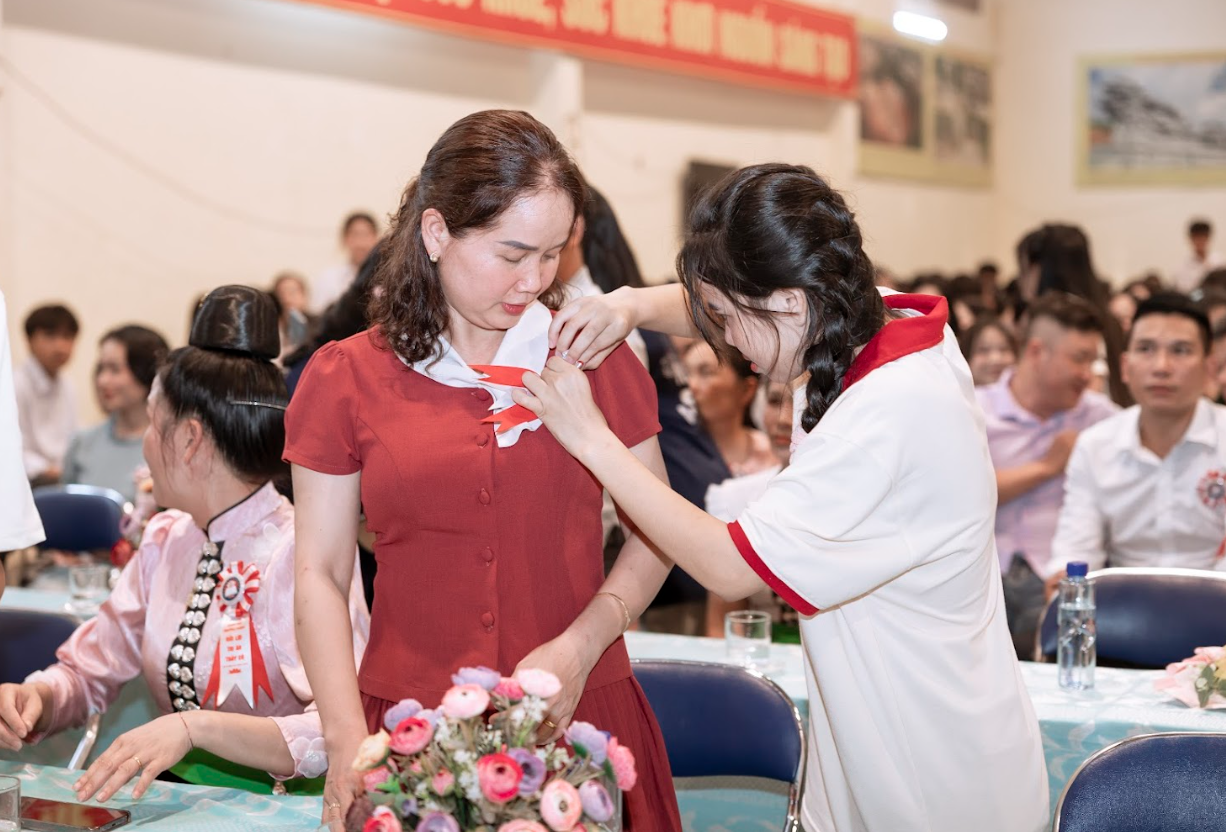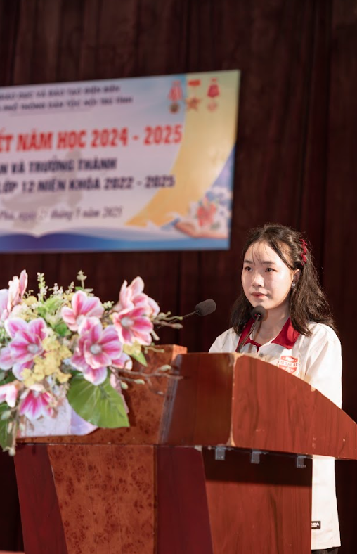 Điểm nhấn giàu cảm xúc của buổi lễ chính là phần Tri ân và Trưởng thành dành cho học sinh lớp 12 - những chàng trai, cô gái đang ở ngưỡng cửa rời xa mái trường để bước vào một hành trình mới của cuộc đời. Đại diện cho toàn thể học sinh khối 12, em Lò Thị Thủy Tiên đã có bài phát biểu lắng đọng và sâu sắc. Trong từng câu chữ, từng lời nói chân thành là cả một trời yêu thương dành cho thầy cô, cha mẹ - những người đã âm thầm dạy dỗ, dẫn lối và nâng đỡ các em suốt chặng đường trưởng thành.