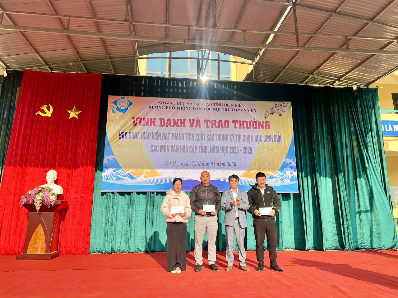 Nhằm kịp thời động viên, ghi nhận công sức của đội ngũ giáo viên bồi dưỡng và chúc mừng các em học sinh đạt giải, sáng ngày 12/01/2026, Trường PTDTNT THPT Nà Hỳ đã long trọng tổ chức chương trình vinh danh giáo viên và học sinh đạt thành tích xuất sắc trong công tác bồi dưỡng học sinh giỏi cấp tỉnh. Buổi lễ diễn ra trong không khí trang trọng, ấm áp và đầy xúc động, lan tỏa niềm vui chung của một tập thể đoàn kết, trách nhiệm và giàu yêu thương.