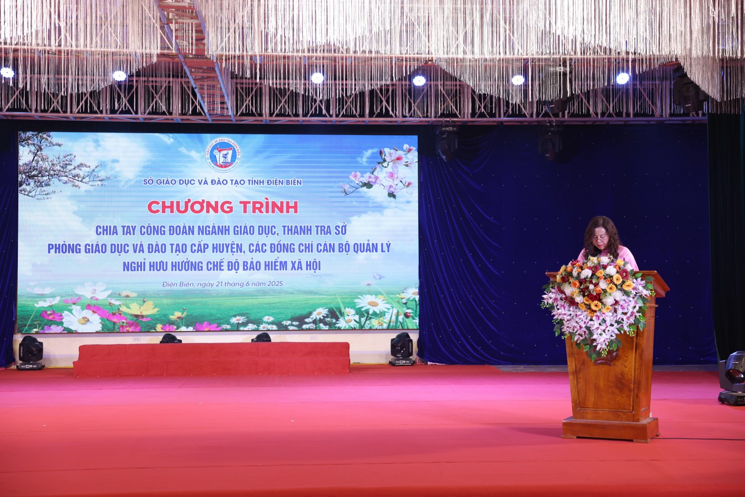 Phát biểu tại Chương trình, Nhà giáo Hoàng Tuyết Ban - UVBCH Đảng ủy UBND tỉnh, Bí thư Đảng ủy, Giám đốc Sở Giáo dục và Đào tạo khẳng định: Việc chia tay các đơn vị trong quá trình tinh gọn bộ máy không đơn thuần là kết thúc, mà là sự chuyển giao chiến lược, mở ra cơ hội mới để tiếp tục phát huy vai trò, trách nhiệm và sự sáng tạo của mỗi cán bộ, tổ chức trong chặng đường tiếp theo. Đồng chí đã ghi nhận những thành tích nổi bật Công đoàn Ngành Giáo dục, Thanh tra Sở Giáo dục và Đào tạo, Phòng Giáo dục và Đào tạo cấp huyện và các đồng chí cán bộ quản lý nghỉ chế độ trong thời gian qua: