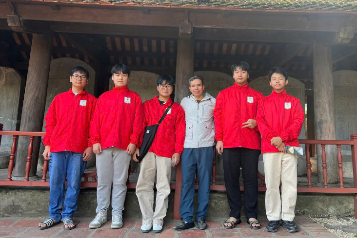 Em Trần Anh Quân cùng thầy giáo Phạm Ngọc Hưng và các thành viên đội tuyển HSGQG môn Toán chụp ảnh lưu niệm tại Văn Miếu - Quốc Tử Giám