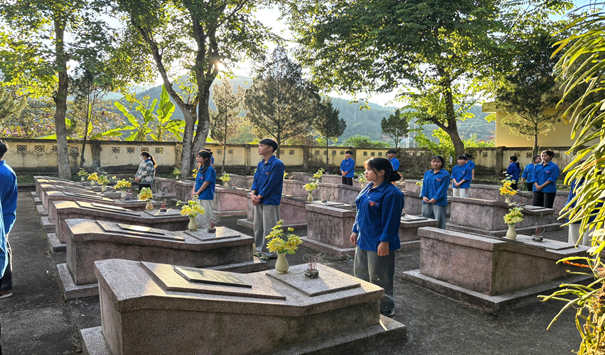 Trong không khí trang nghiêm, từng nén hương được thắp lên như một lời gửi gắm của thế hệ hiện tại đến những người đã nằm xuống. Trước anh linh các anh hùng liệt sĩ, đoàn viên – học sinh dành phút mặc niệm đầy xúc động, tưởng nhớ những người con của Tổ quốc đã hiến dâng tuổi xuân và cả cuộc đời cho nền độc lập hôm nay. Mỗi gương mặt trẻ đều lặng lẽ hướng về hàng bia mộ, như nhìn thấy trong đó tiếng gọi âm thầm của lịch sử: hãy tiếp bước, hãy sống xứng đáng với những hi sinh thầm lặng mà vĩ đại.