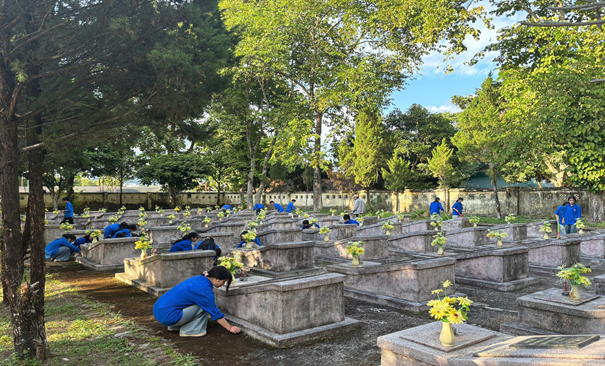 Sau phần lễ, các bạn đoàn viên đã tiến hành vệ sinh, chăm sóc phần mộ liệt sĩ trong toàn khuôn viên nghĩa trang. Việc nâng niu từng cành hoa, từng nắm đất không chỉ là hoạt động lao động đơn thuần, mà còn là sự tiếp nối mạch nguồn tri ân – một bài học sống động về lòng biết ơn, trách nhiệm và nhân cách mà không trang sách nào có thể truyền đạt trọn vẹn.