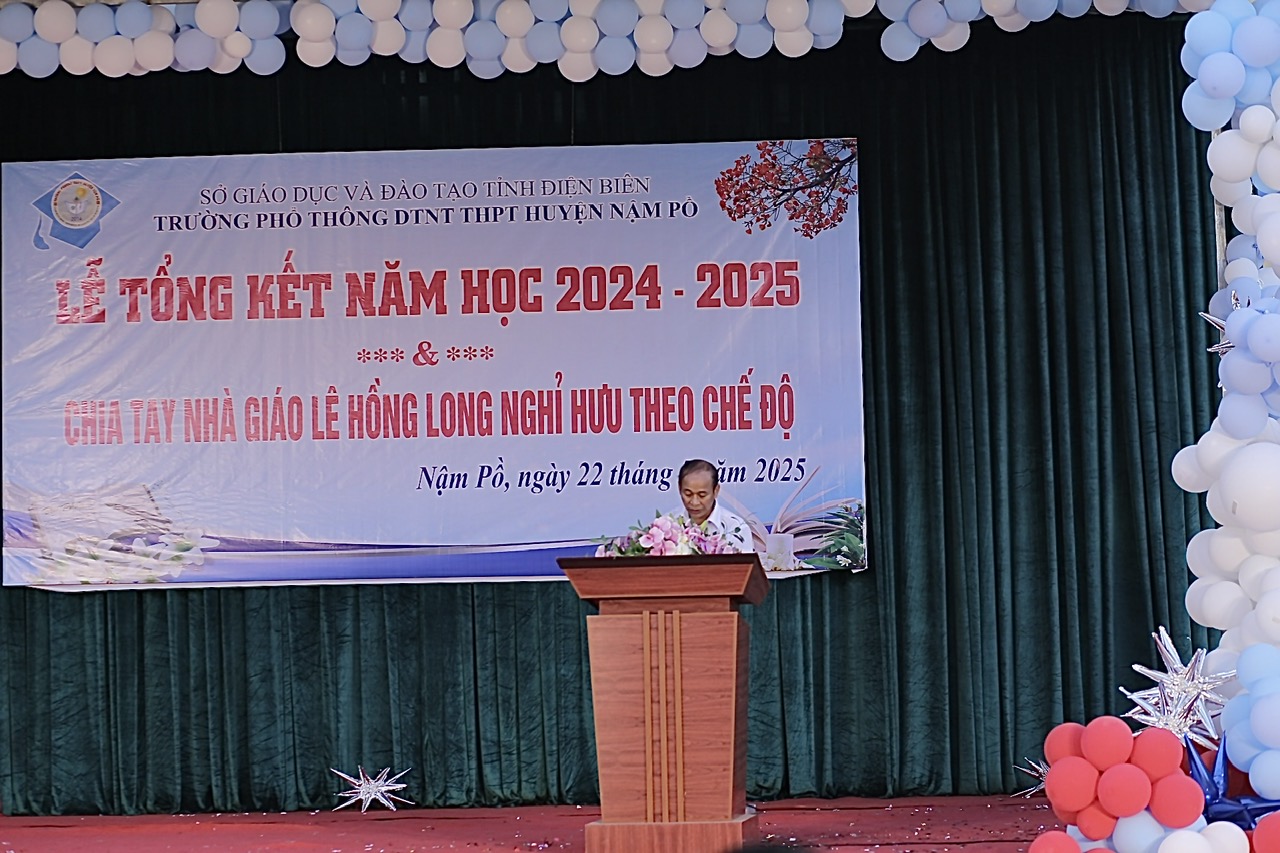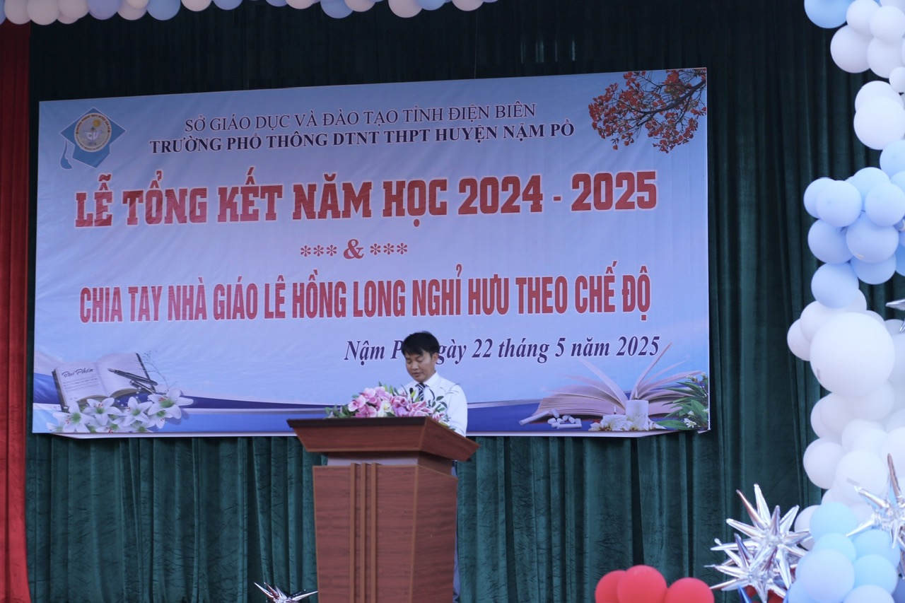 Nếu như phần tổng kết là điểm nhấn của hành trình giáo dục trong năm học, thì giây phút chia tay thầy giáo Lê Hồng Long lại là điểm lặng đầy cảm xúc của buổi lễ. Một người thầy đã gắn bó, dạy dỗ và vun trồng tri thức cho học sinh vùng cao trong suốt nhiều năm công tác, từ những ngày đầu gian khó khi trường mới thành lập.