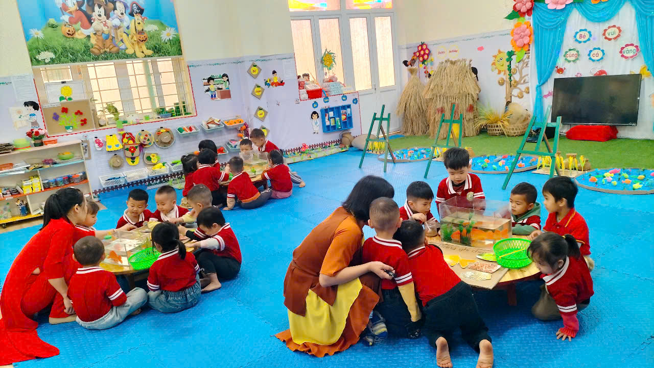Thứ hai: Xây dựng môi trường giáo dục phù hợp; không gian lớp học và khu vui chơi ngoài trời được bố trí khoa học, linh hoạt theo độ tuổi, nhu cầu và sở thích của trẻ. Các góc hoạt động được thiết kế mở, đa dạng nguyên vật liệu để trẻ chủ động lựa chọn và trải nghiệm.