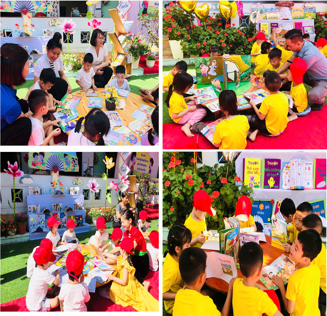 Ngày hội đọc sách được tổ chức với các nội dung hoạt động cụ thể: Khu vực chính: Văn nghệ chào mừng; Chơi các trò chơi vận động với sách: Đoán tên truyện qua tranh minh họa; Tìm sách đúng với mô tả của cô. Xếp tranh truyện theo trình tự đúng; Khu vực hoạt độngn tại các góc: Góc sách yêu thương: Trưng bày sách. Sắp xếp các loại sách theo ý thích và theo yêu cầu. Cô, phụ huynh giới thiệu các loại sách cho trẻ. Góc đọc sách: Giới thiệu các đầu sách mới. Đọc sách: cá nhân, nhóm. Chia sẻ về cuốn sách vừa đọc với bạn. Tô màu, vẽ tranh; Góc sáng tạo cùng sách: Đọc sách thư giãn. Thiết kế bìa sách, làm album sách, chơi với các nguyên vật liệu đã chuẩn bị để trang trí tạo sách sáng tạo. Vẽ minh họa cho nhân vật/câu chuyện em yêu thích; Thư viện mở cửa: Xe thư viện lưu động, hướng dẫn thư viện số miễn phí cho trẻ em, phụ huynh học sinh, giao lưu chia sẻ với phụ huynh. Các hoạt động trong ngày hội đều có sự tham gia hưởng ứng nhiệt tình của đông đảo quý phụ huynh, các cô giáo và các bé thân yêu của nhà trường với những màn biểu diễn chuyên nghiệp, những câu hỏi ngây ngô, dí dỏm và đầy ý nghĩa của các bé dành cho cô giáo và phụ huynh trẻ khi đến với những trang sách kỳ diệu.