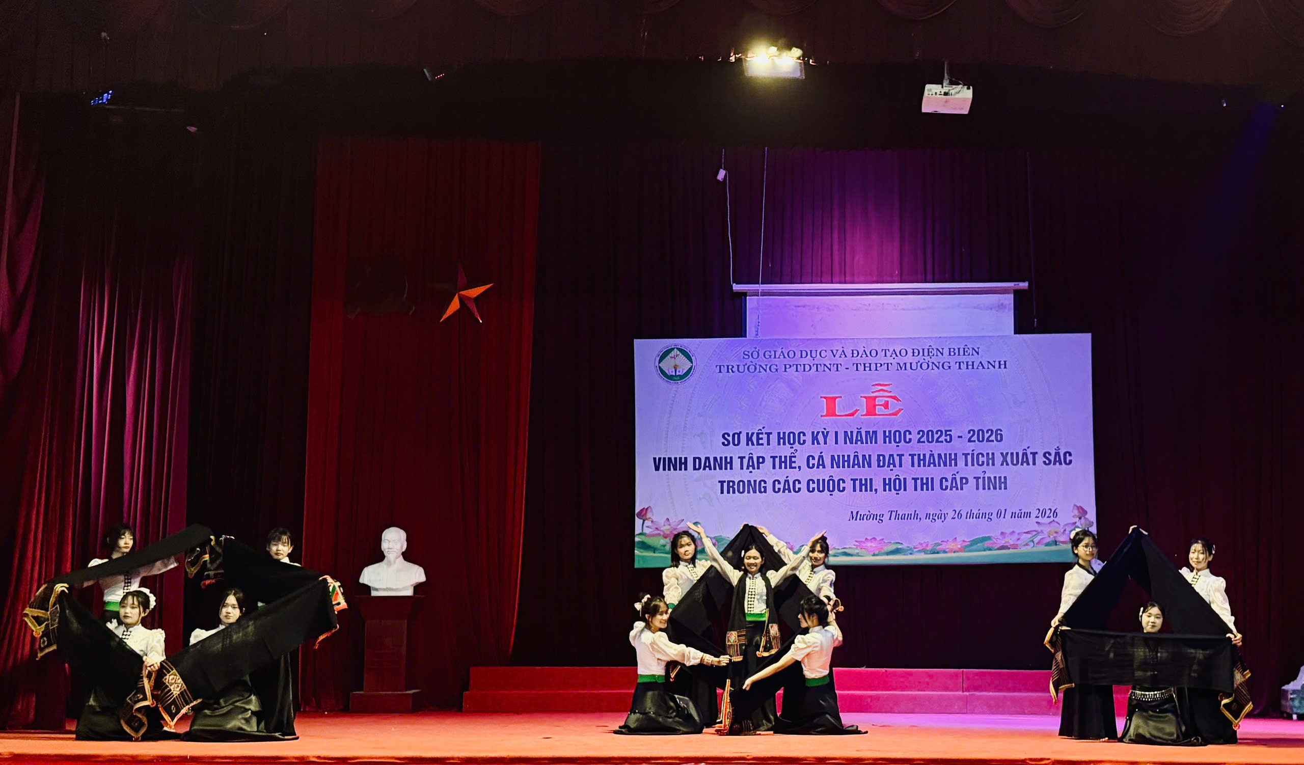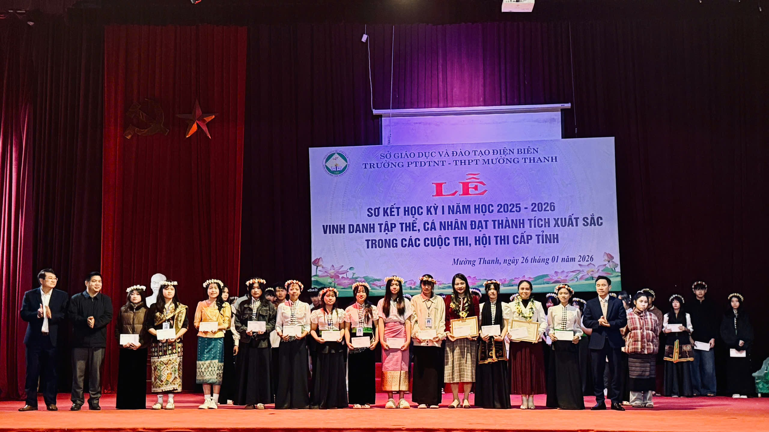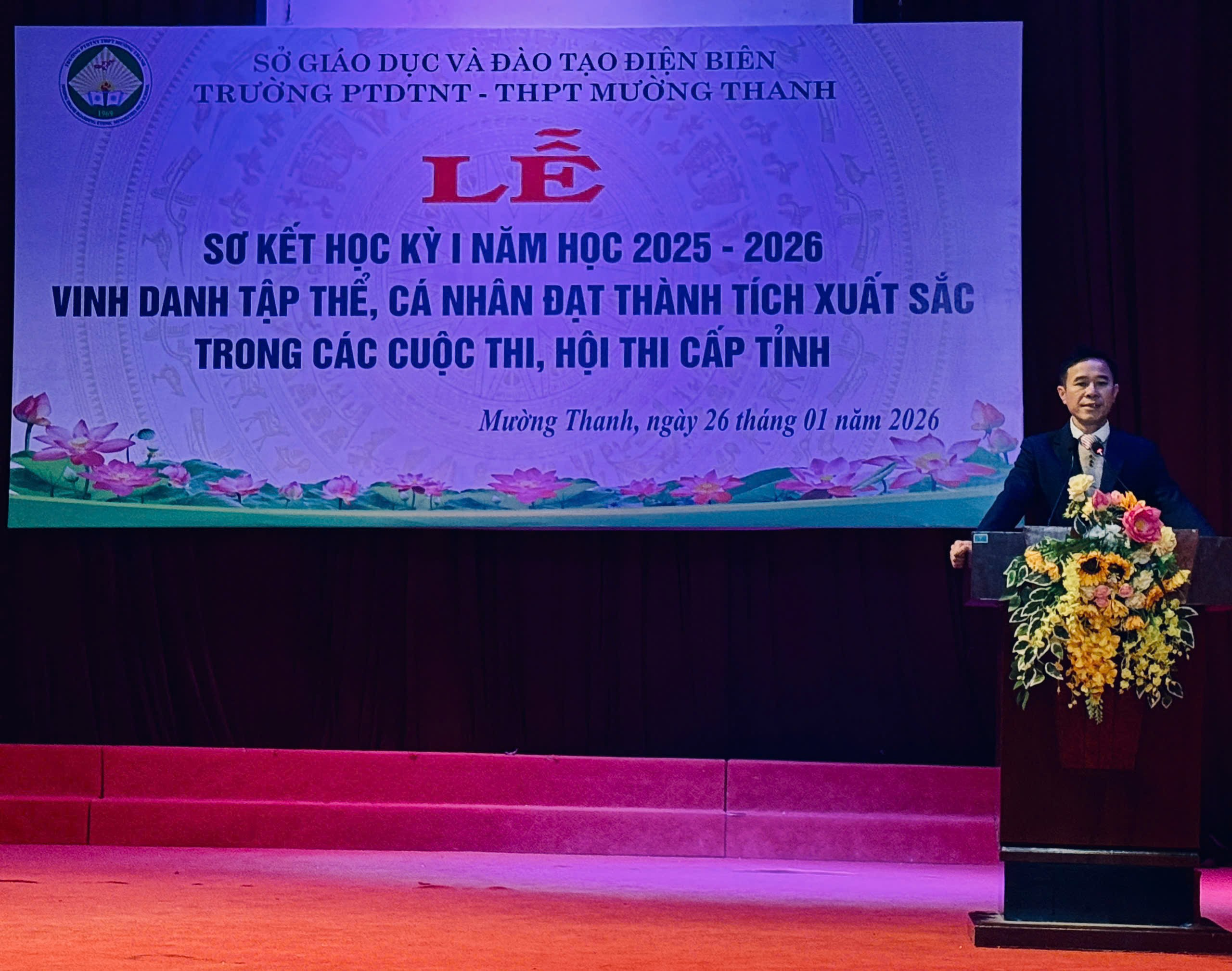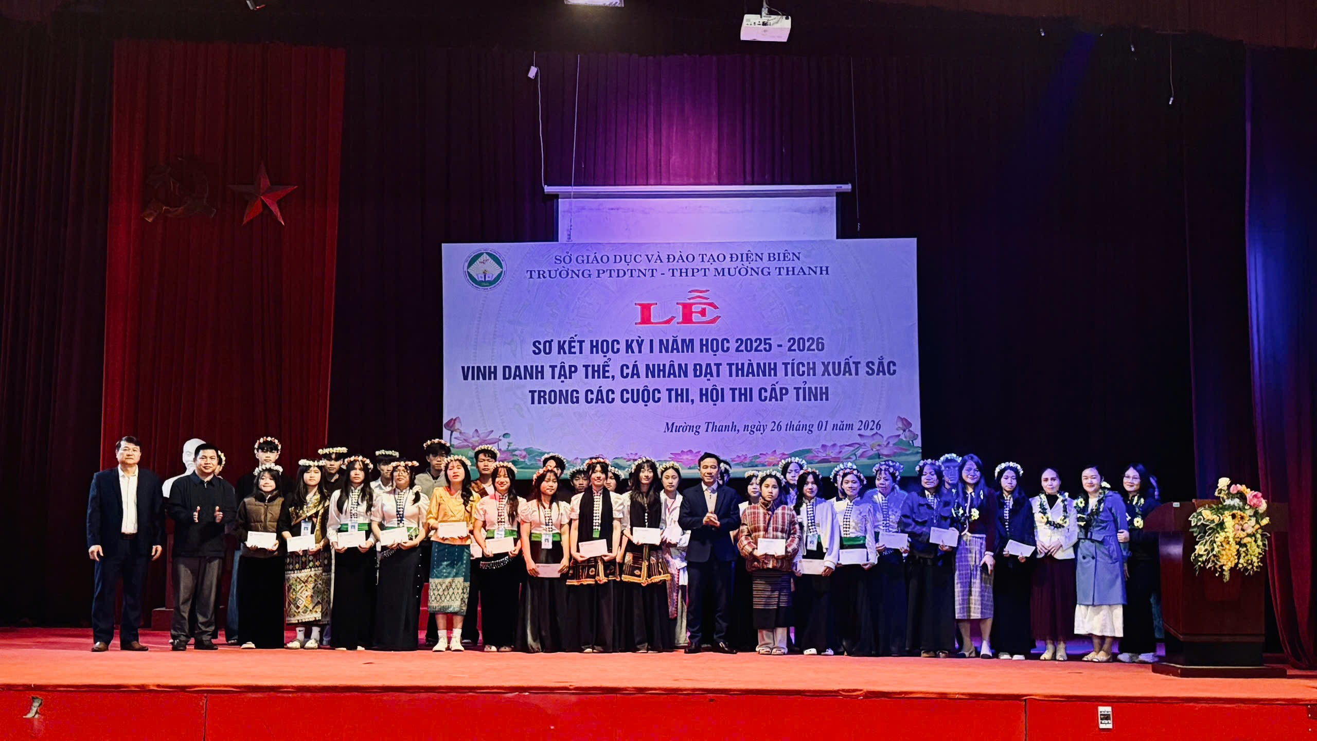 Sáng ngày 26/01/2026, trong không khí phấn khởi cả nước thi đua chào mừng thành công Đại hội toàn quốc lần thứ XIV của Đảng và đón chào một mùa xuân mới, trường PTDTNT THPT Mường Thanh long trọng tổ chức Lễ sơ kết học kì I năm học 2025–2026. Buổi lễ được tổ chức trong không khí trang nghiêm, phấn khởi nhằm đánh giá kết quả thực hiện nhiệm vụ dạy và học của nhà trường trong học kì I.