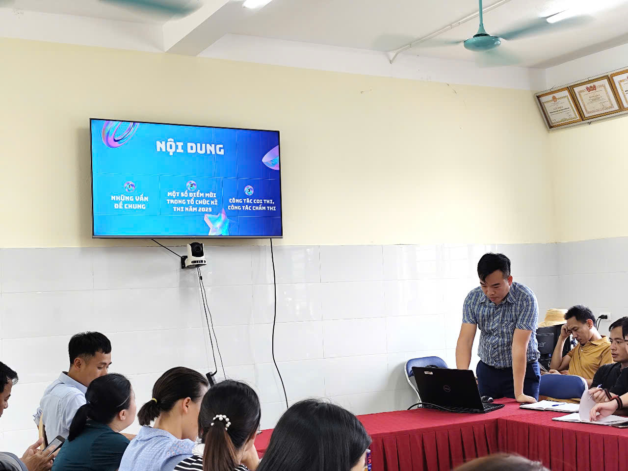 Một trong những nội dung chính của buổi tập huấn là việc triển khai toàn bộ quy chế thi tốt nghiệp THPT hiện hành. Qua đó, cán bộ và giáo viên, nhân viên được củng cố các nghiệp vụ cơ bản như: quy trình tổ chức coi thi, chấm thi; xử lý các tình huống phát sinh trong phòng thi; cách nhận diện và xử lý các hành vi vi phạm quy chế thi của thí sinh hoặc cán bộ coi thi; công tác bảo mật đề thi, bài thi… Việc hệ thống hóa và ôn tập lại quy chế không chỉ giúp giáo viên “nắm chắc” từng khâu trong tổ chức kỳ thi, mà còn tạo tiền đề để toàn trường phối hợp hiệu quả khi bước vào đợt thi chính thức vào tháng 6 tới. Phát biểu khai mạc tại buổi tập huấn, đồng chí Lê Trường Giang - Hiệu trưởng nhà trường đề nghị toàn thể đội ngũ cán bộ, giáo viên, cán bộ coi thi, chấm thi phải chủ động nắm chắc nghiệp vụ, quy trình tổ chức thi, từ khâu coi thi, chấm thi đến xử lý các tình huống phát sinh tại điểm thi. Tinh thần xuyên suốt được nhấn mạnh là: “Không chủ quan, không lơ là, ỷ lại vào kinh nghiệm, không tự ý xử lý tình huống ngoài quy chế”.