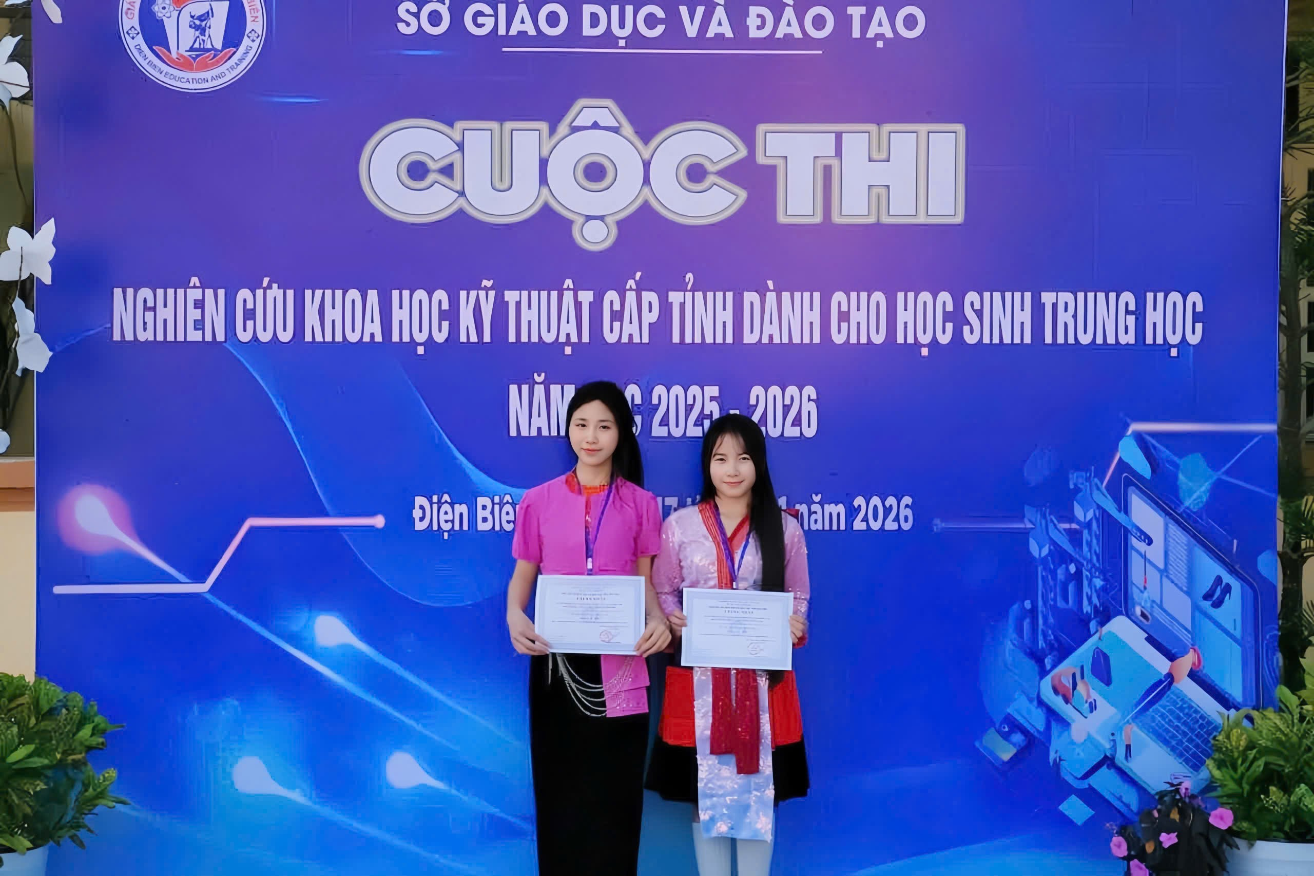 Học sinh Nguyễn Thị Thanh Huyền và học sinh Giàng Thị Yến Nhi nhận giải thưởng